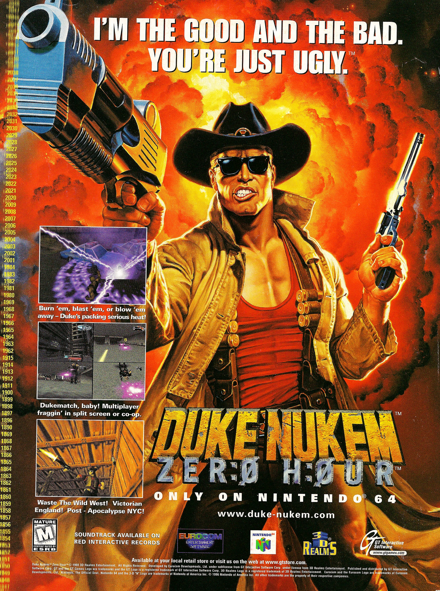 Zero Hour continues the Duke Nukem saga that began on the PC. The evil space hogs have returned to make Earth a gigantic pig sty--and this time they're using time travel to wipe out mankind! Its the perfect setup for Duke's hard-hitting 3D action/adventure run-n-gun gameplay as you hunt extraterrestrials from post-apocalyptic New York City to the Old West and Victorian England.