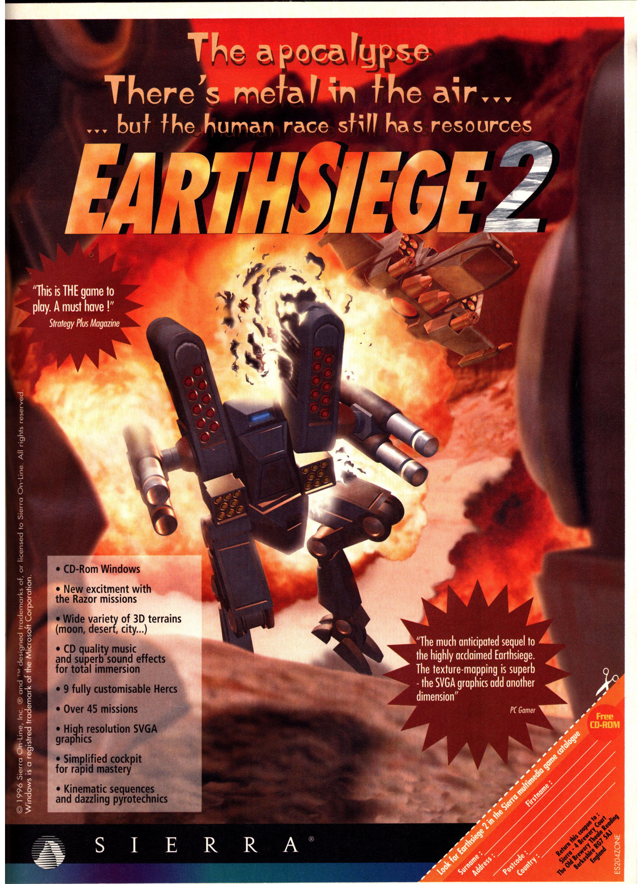 You get your choice of murderous mechwars or aerial combat in this sequel to Earth-Siege. Either way, expect excellent explosions, awesome armaments, and riveting, riotous shooting action. In EarthSiege 2, you lead a squadron against invading Cybrid forces. Stunning high-resolution graphics and digitized voices heighten the realism.