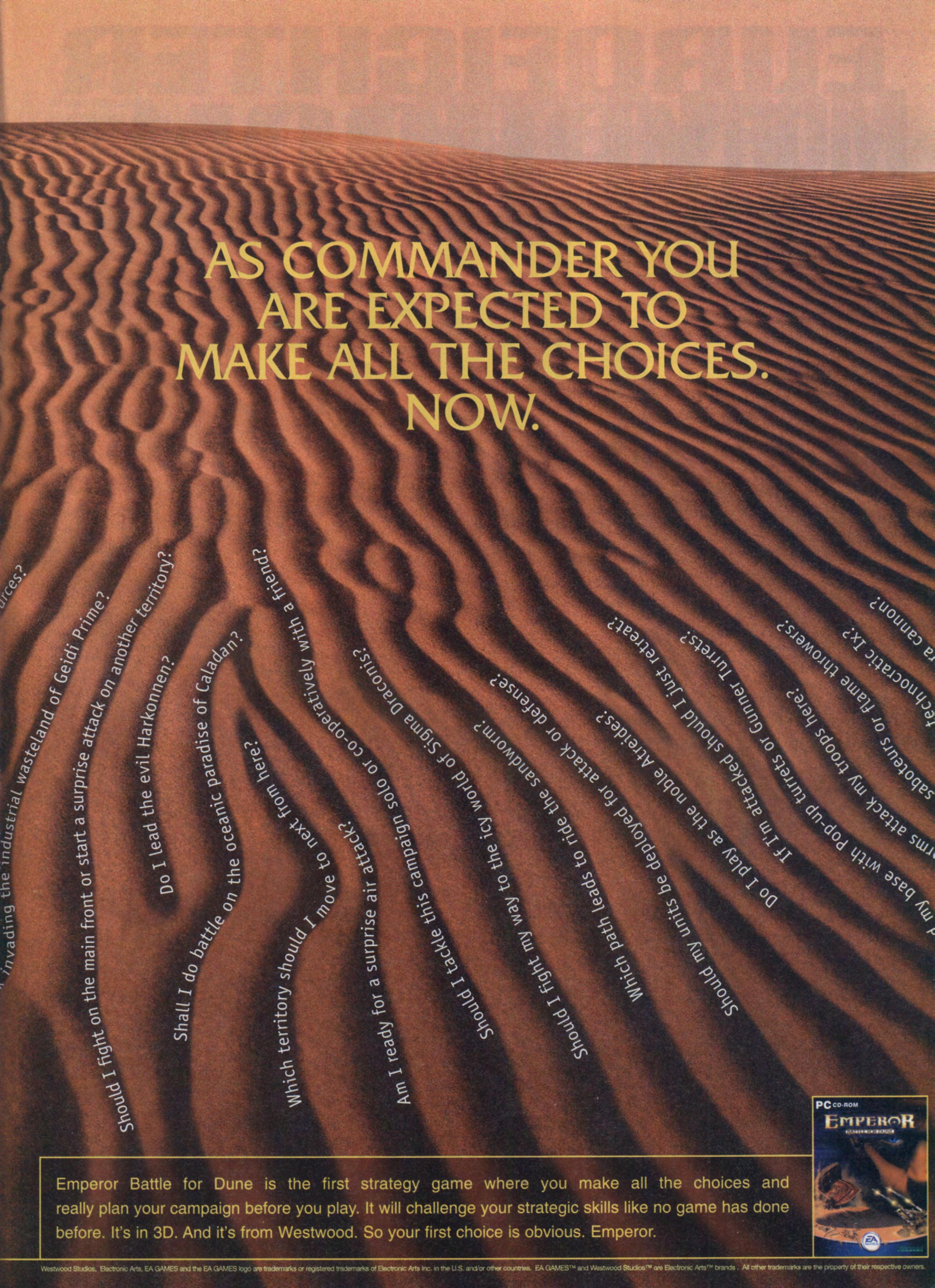 Westwood pioneered the RTS genre eight years ago with the release of Dune 2. Since then, we have continued to build on our tradition of creating interactive and fun RTS games with successive Dune games and the C&C series. Emperor is a true RTS game - those familiar with Dune and C&C games will feel right at home with it, while newcomers to the genre will be able to pick it up with minimal effort. That's another element we're bringing to Emperor: gameplay for all skill levels.