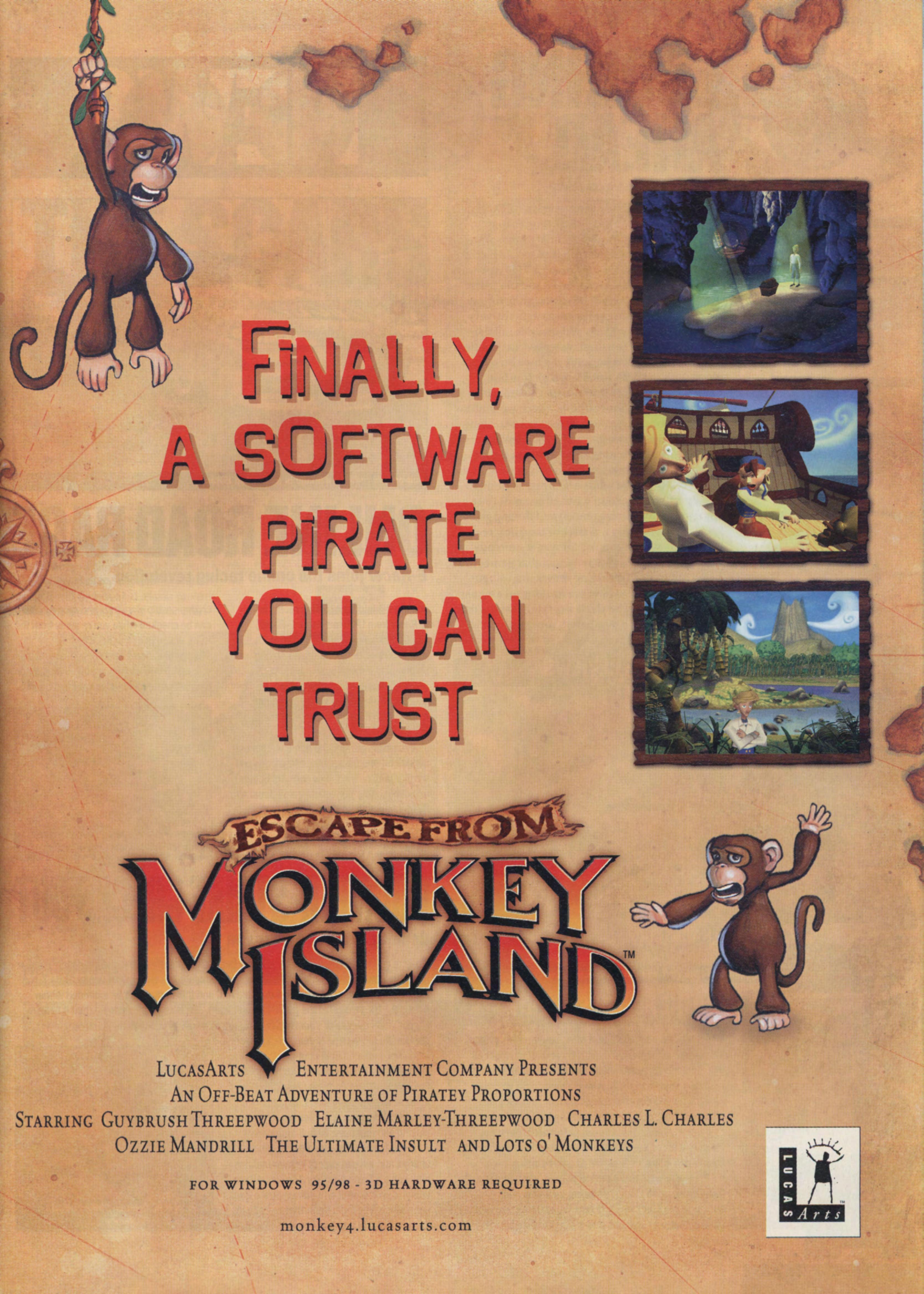 Escape from Monkey Island, the fourth game in LucasArts’ popular Monkey Island series and the first in 3D, offers "new jokes, new puns, new insults, and more monkeys than the three previous Monkey games combined." Does it follow through? Well, yes... but is it worth buying?