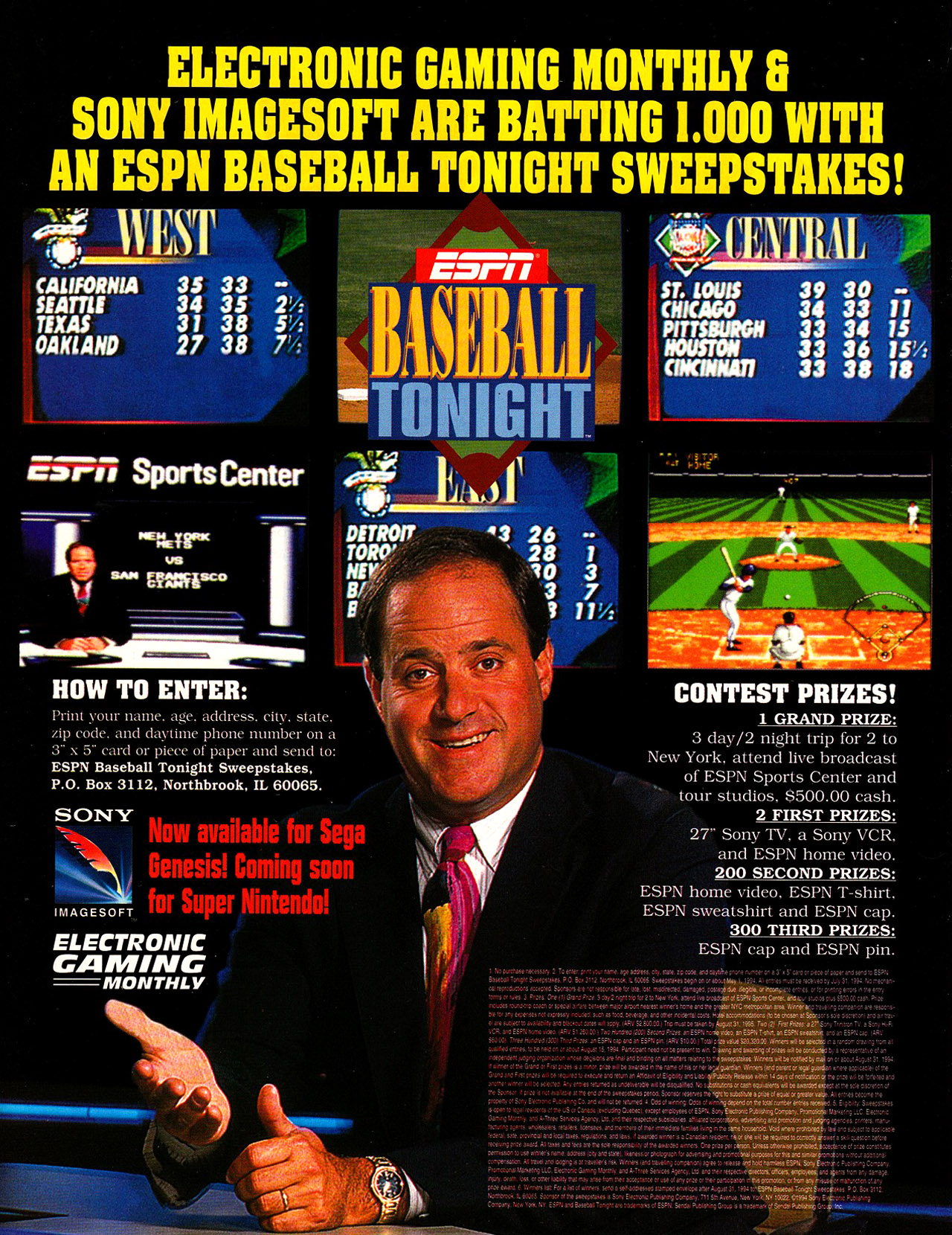ESPN has teamed up with Sony Imagesoft to give you another great title for your Sega CD. First made for the Super NES, this CD version is exactly the same when comparing the game play. As for the sounds and graphics, the CD capability has greatly enhanced the voices and sounds on the field, while extra footage straight from the pros has been added to give you a more realistic environment. But wait, that's not all that makes this one of the best baseball games around.
