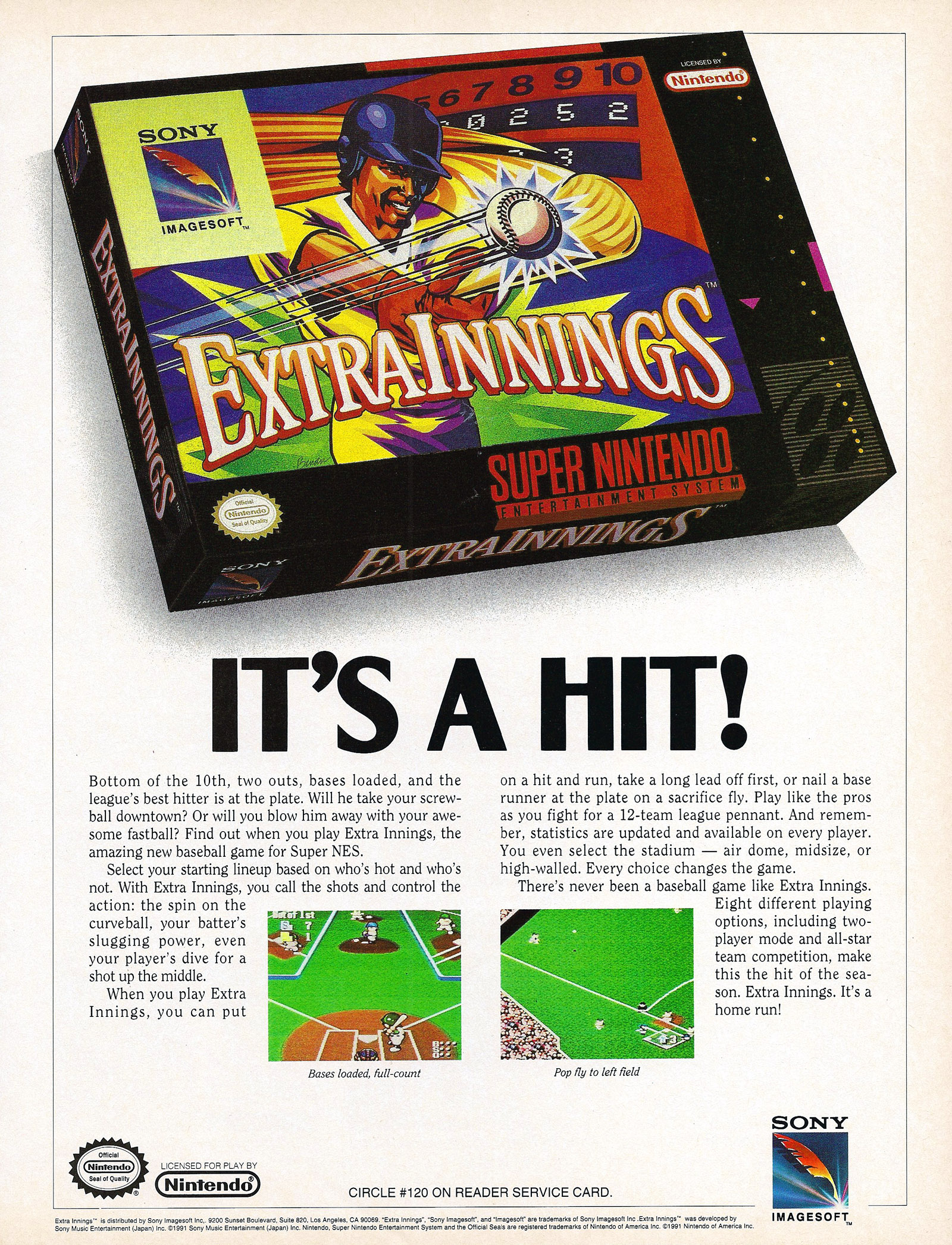 Pick up your catcher's mitt, strap on your batting glove, pick up your favorite team hat, and get ready to play ball! Extra Innings represents one of the first baseball entries for the Super NES. From the scaling and rotation of the title screen and playing field to the multiple angles of play, Extra Innings sends pitches at you at speeds of over 100 mph and gives you the opportunity to be a hero at America's favorite pastime.