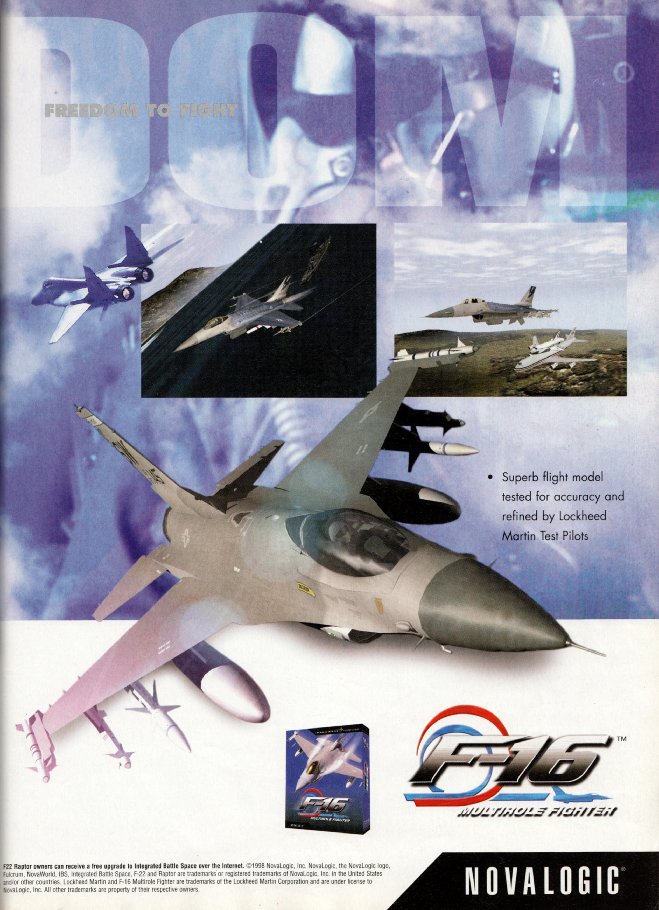 Perhaps the most exciting aspect of _F-16 Multirole Fighter and MiG-29 Fulcrum is the fact that virtual pilots can organize squadrons and fight it out on the NovaWorld servers with up to 120 planes, including the F-22 Raptor. Six Deathmatch and six A.W. (Air War) cooperative missions are available. NovaWorld service is free. This offer is quite remarkable, considering the overwhelming problems with internet play in other combat flight games.