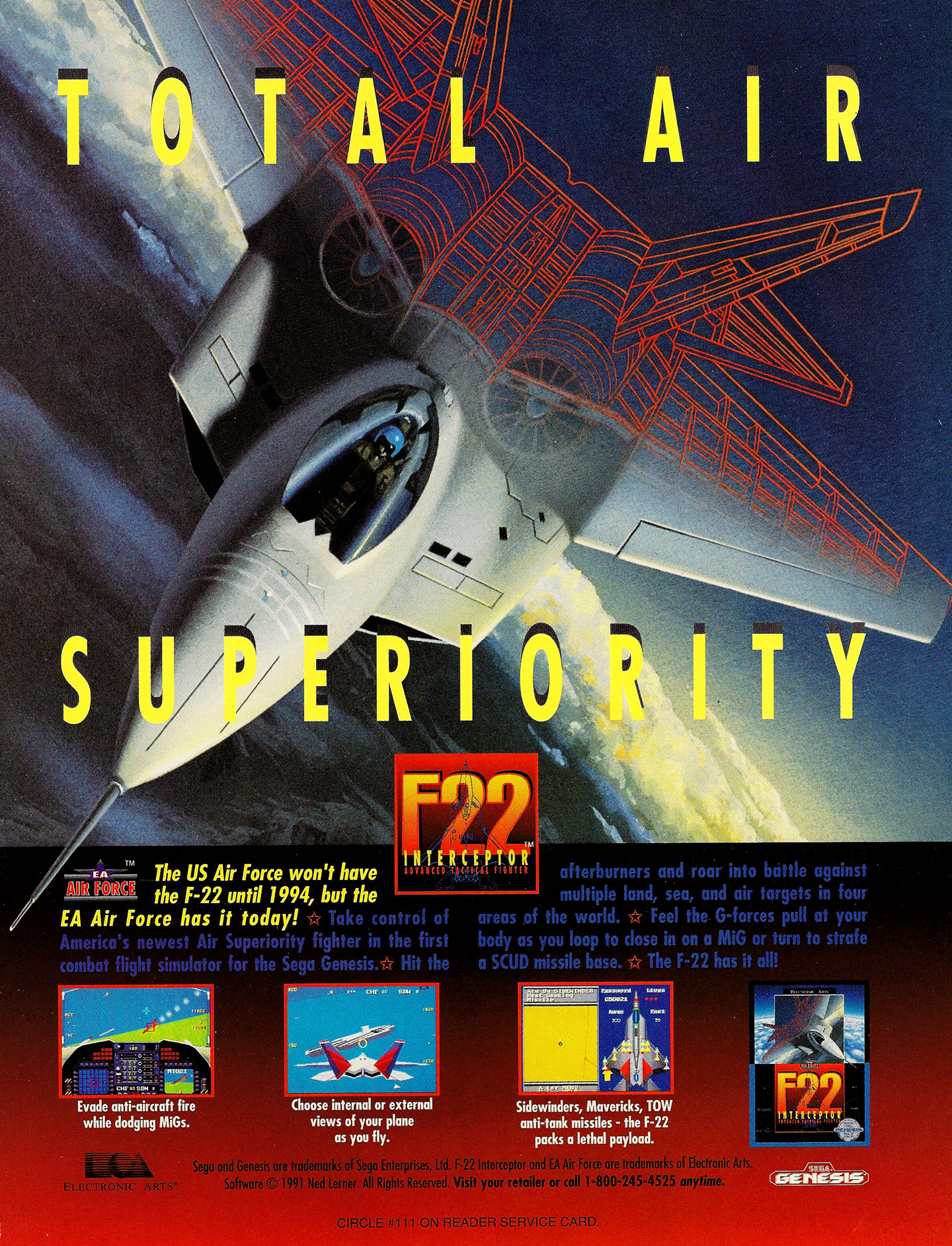 F-22 Interceptor by Electronic Arts is a top notch Genesis jet combat flight simulator -- in fact it's the only Genesis flight simulator patrolling the video airways. And that's "flight simulator" not "flying game". This game isn't at all like arcade aerial shoot-em-ups such as Afterburner or Air Diver.