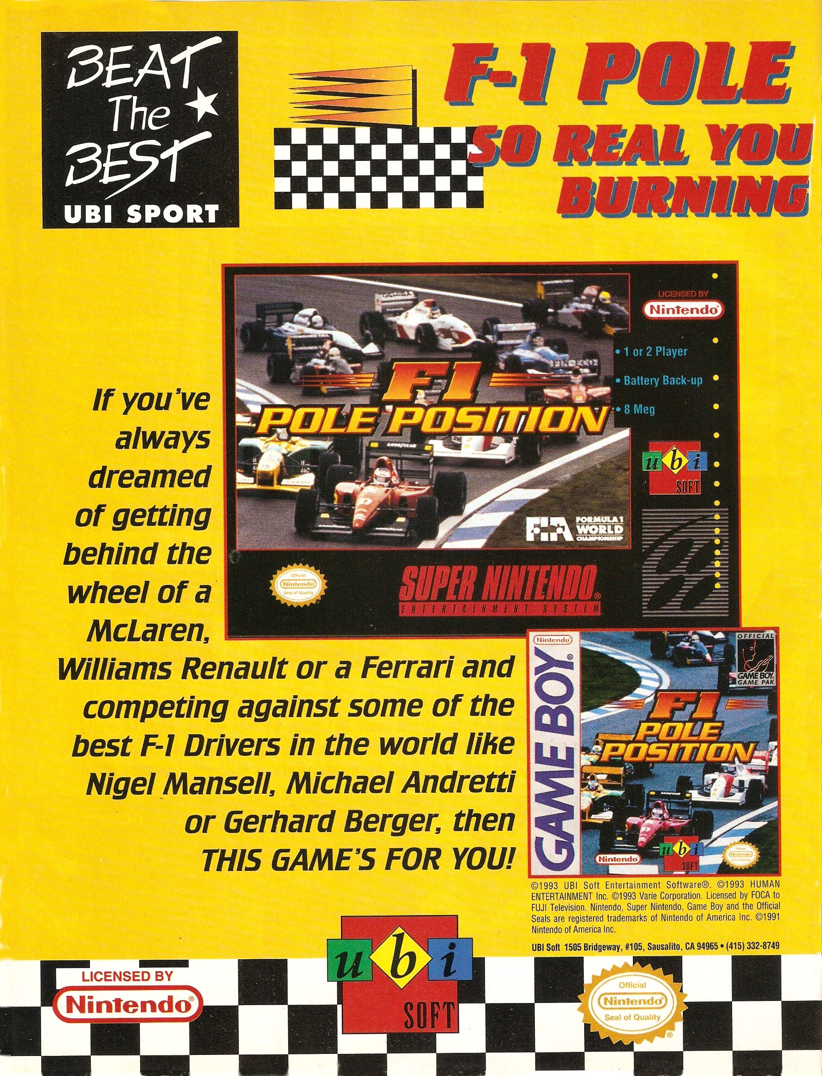 Coming fast around the Formula One track is a terrific new SNES racing game. UBI Soft's F-1 Pole Position is a complex, feature- filled racing "simulation" geared more for die-hard racers than casual gamers. Excellent graphics and animation, 16 international tracks, world-class opponents like Andretti and Mansell, and tons of options make this game a winner!