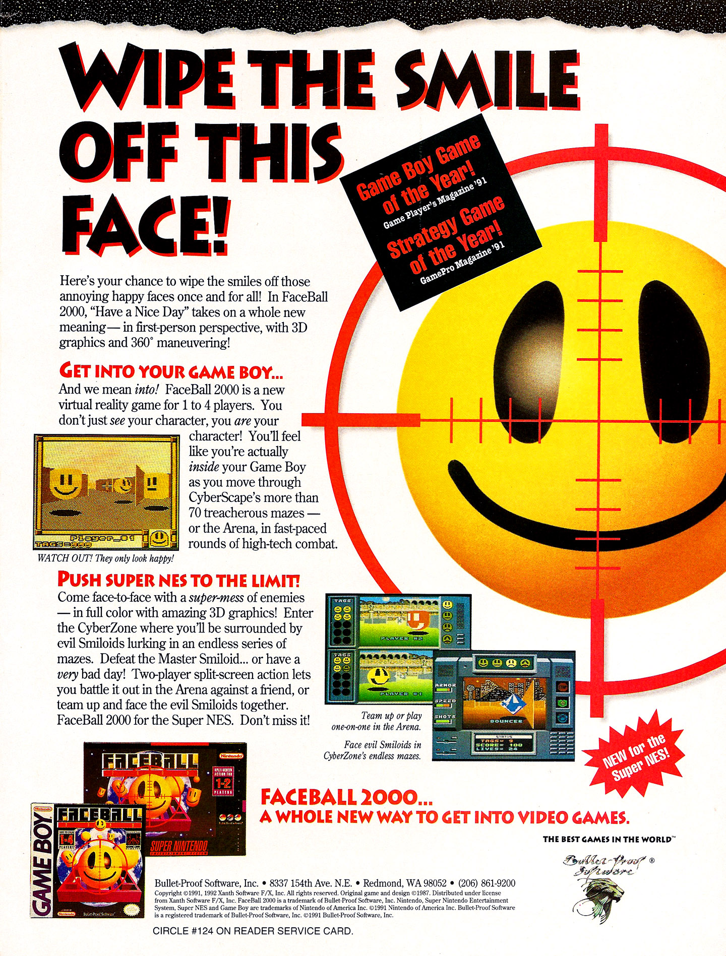 If you had a "nice day" with Faceball 2000 for the 7 Game Boy, get set to put on a new Smiley face with the Super NES game due out in June. Here's a preview of Bullet-Proof Software's 16-bit version of virtual reality tag-ball.