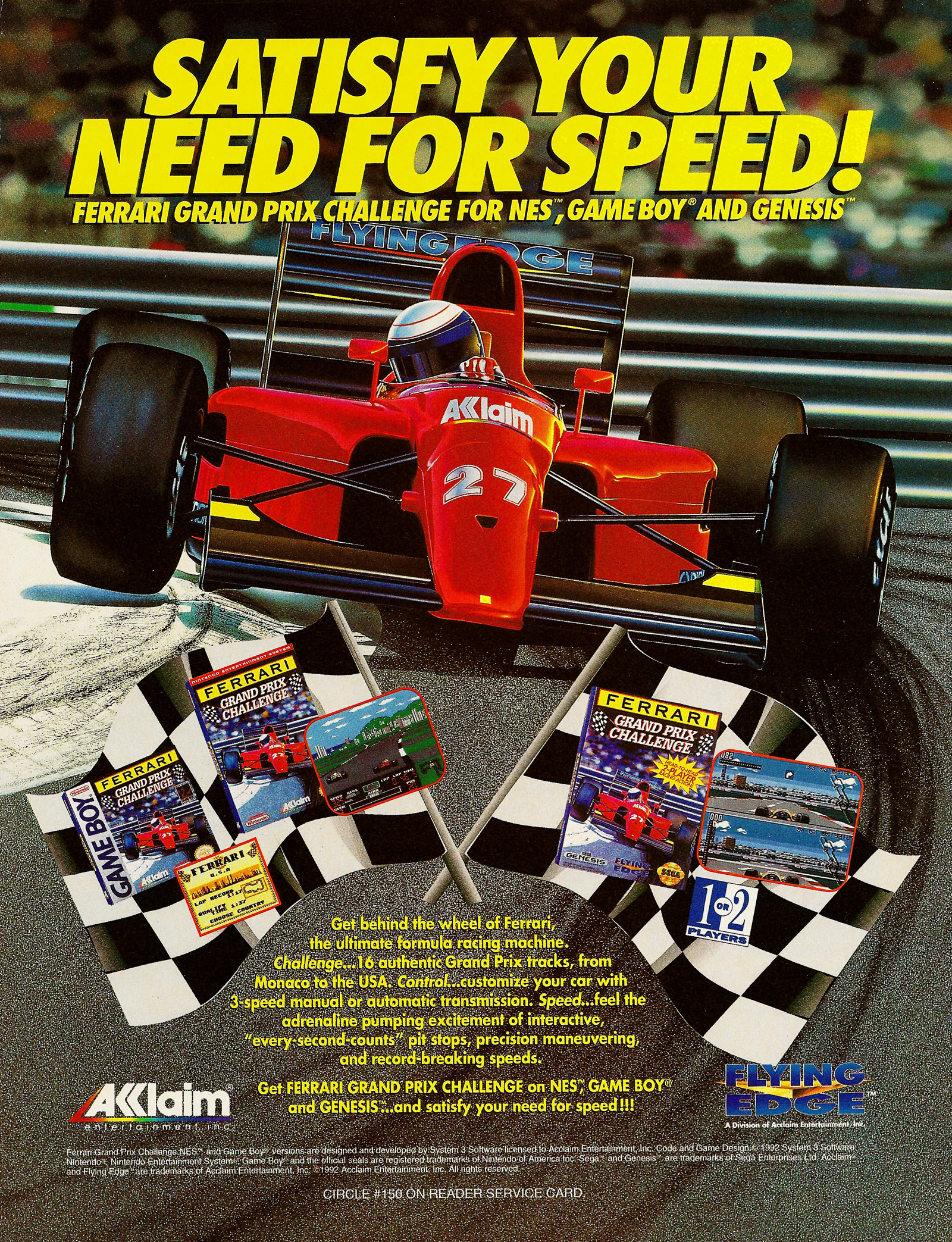 The brain train of Acclaim has been working overtime pumping out some new and exciting NES carts in recent months! Their latest entry into the bulging marketplace is Ferrari: Grand Prix Challenge for the NES. No need to go to Daytona for some hot racing action, the fun is stored in one little 4-Meg monster loaded with challenges.