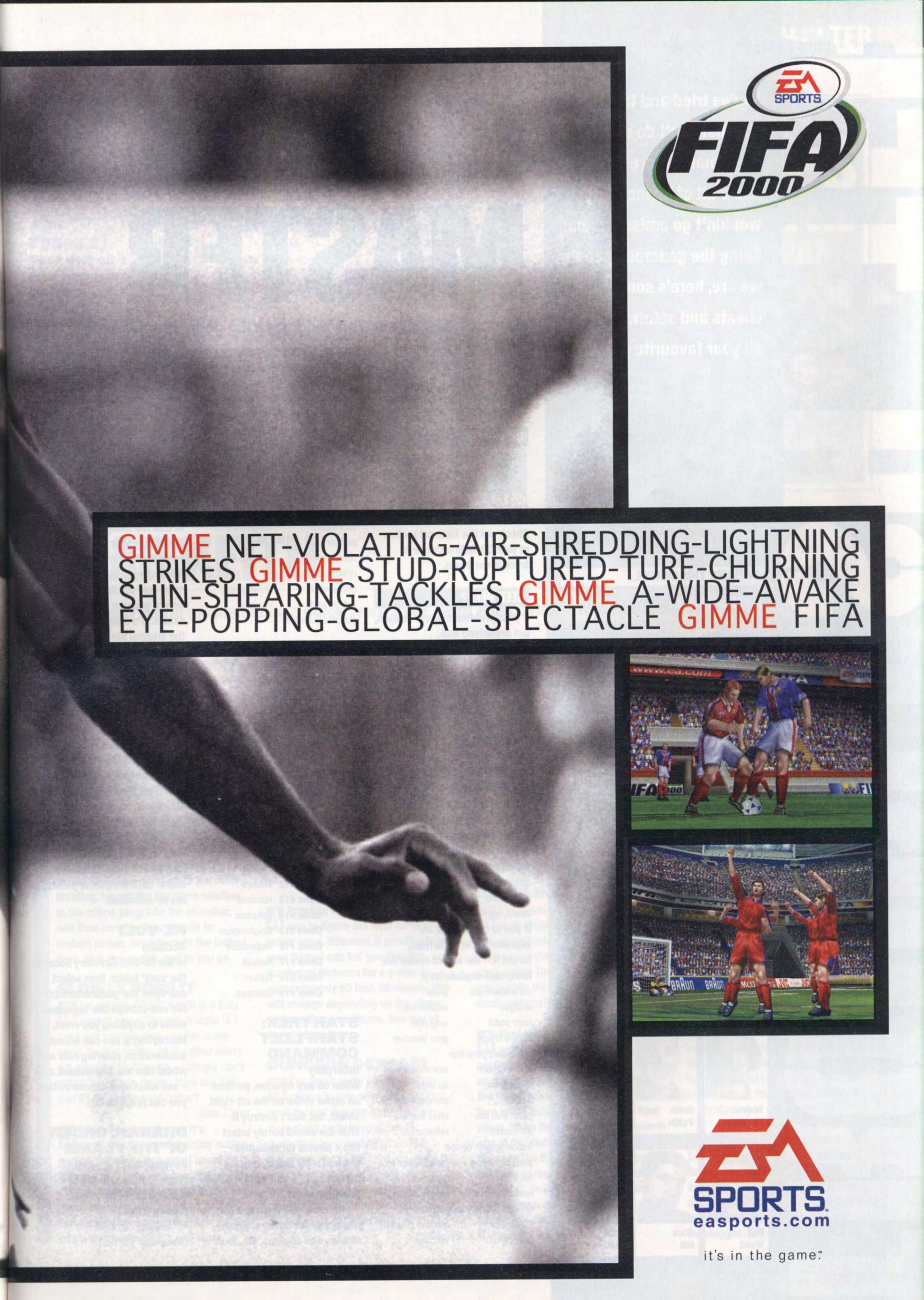 - "FIFA 2000 is a poor follow-up to the excellent FIFA 99. In your review you made no mention of the fact that the passing has been made virtually redundant thanks to a small pitch and lack of player movement."