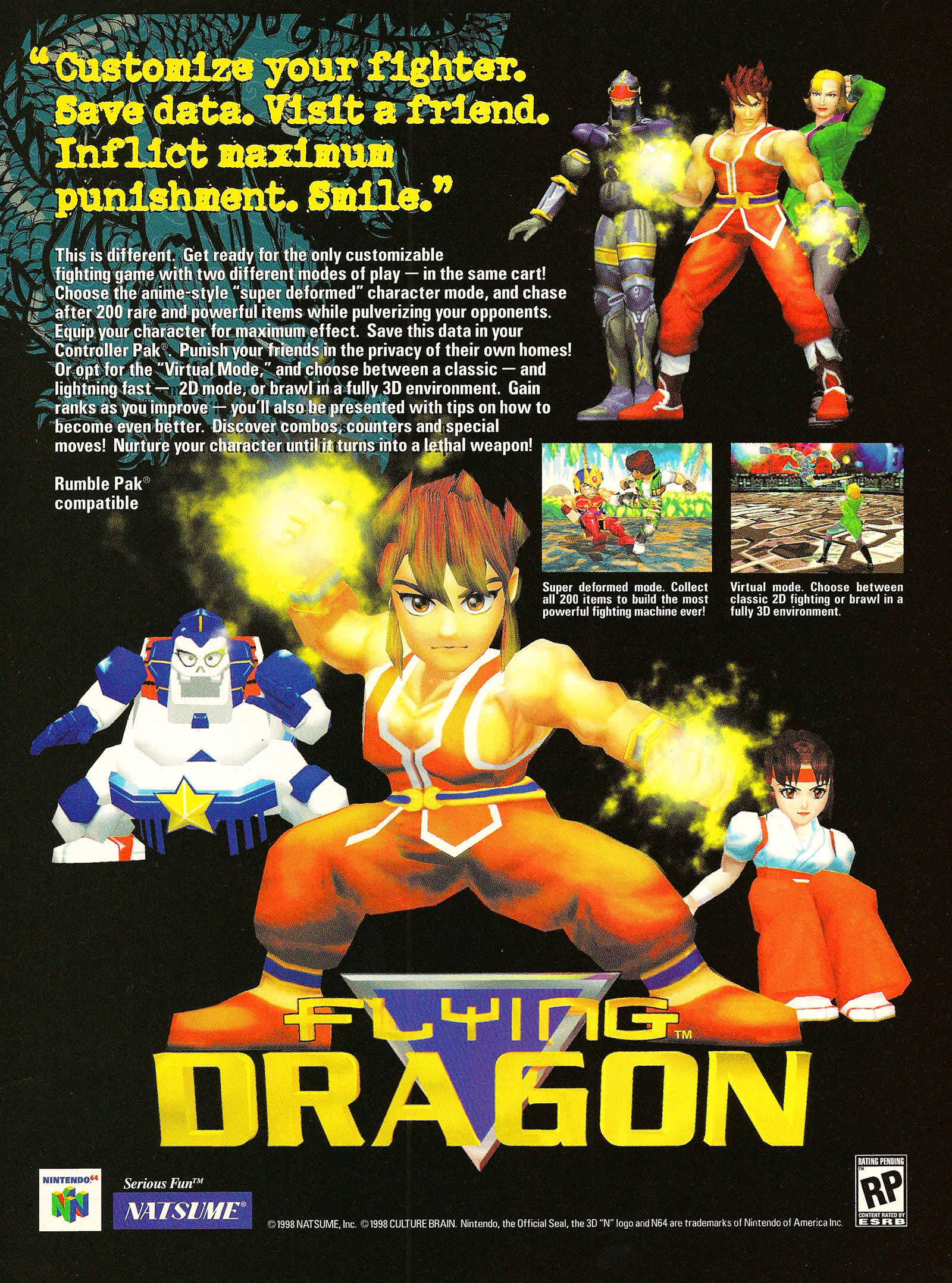 You have to kind of admire this for trying to do something different with the fighting genre. Unfortunately, though, in trying to produce something that has a little bit of everything ("Flying Dragon is ALL fighting games in one!" proclaims the press release), Culture Brain has somehow managed to instead produce something which fails to excel in any area. It's a 3D fighting game, and a 2D fighting game...only both modes look virtually identical. It has "proper" characters and super-deformed characters. It offers Tournament Modes for up to eight players (also team play) and a Story Mode...and each of these offer more features than most fighting games. The most important and ambitious feature of the game though is the Monster Maker-esque character development found in the Super-Deformed game. Winning fights provides credits which can be used to purchase and upgrade more than 200 pieces of equipment. Building up this gear makes a fighter more powerful...and a more formidable fighter when taken back to the tournaments (by saving to a Controller Pak). You can customize controls, you can use combos, specials and counters...you name it. Shame it looks, sounds, and plays like a real dog. The animation is appalling, and gameplay-wise--this really ain't no Tekken or VF.