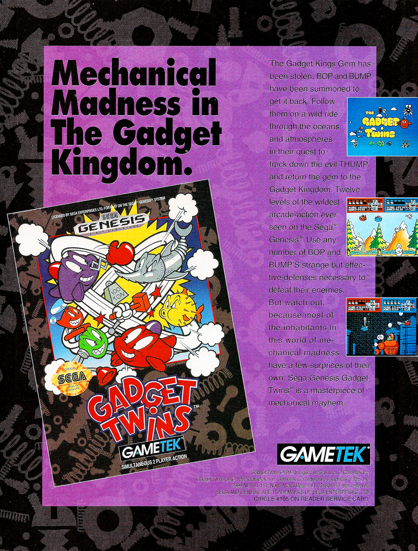 In the far-away place called Gadget Land, the evil Thump has stolen the Magic Gem from the King's castle! The only hope of getting the Gem back is two brave jets, Bop and Bump! Play Bop and Bump simultaneously, or Bop alone in the one player mode. Begin your journey armed only with your multi-directional boxing glove, and gather more powerful and complex weapons as you progress. These items can be purchased when you pass a shop or by punching open one of the treasure chests scattered about. But no matter what objects or weapons you obtain, Thump has an array of devices designed to challenge Bop and Bump through 12 levels of side-scrolling action!