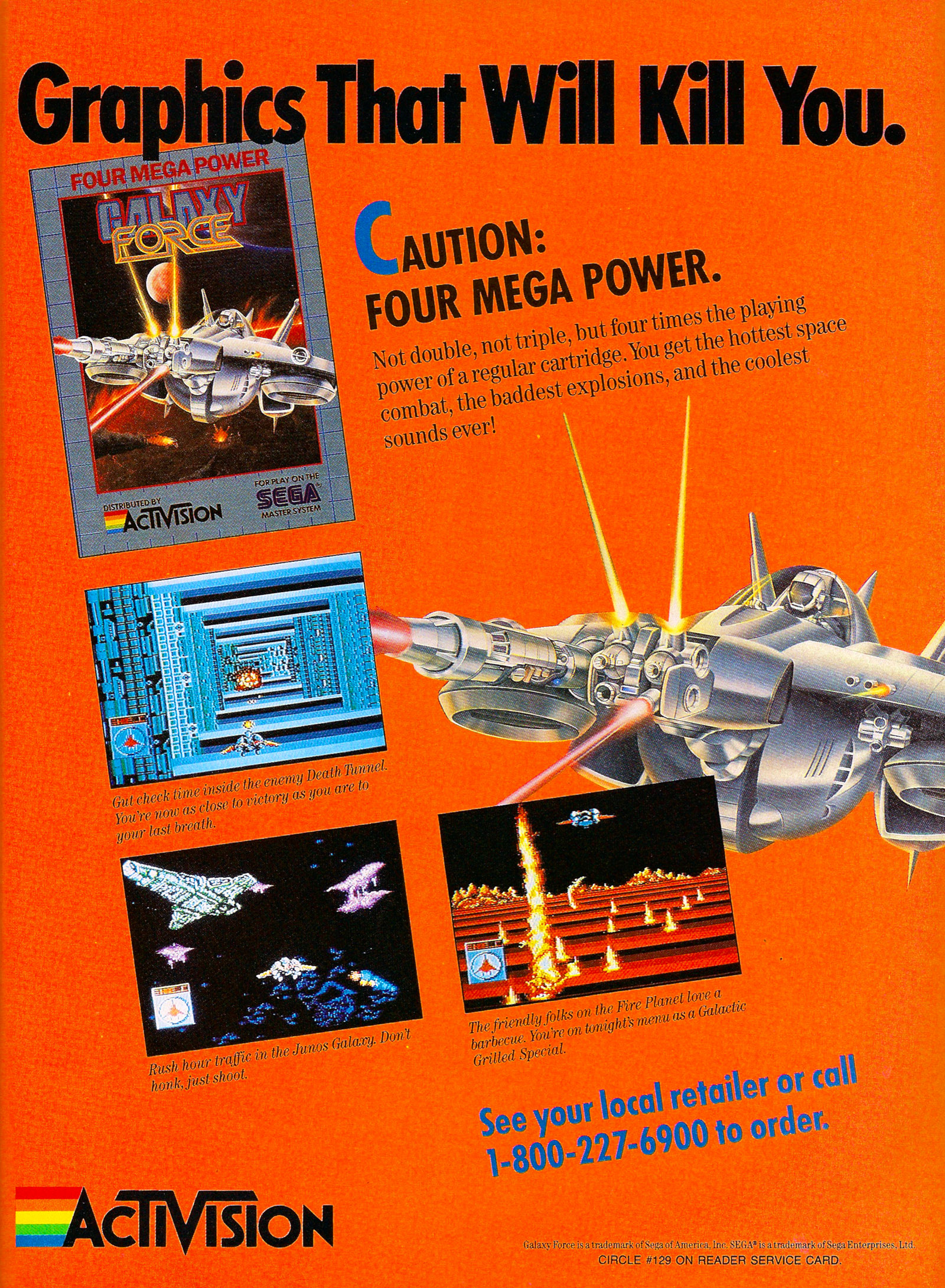 Blast into orbit with Activision's fourth release for the Sega Master System, Galaxy Force. Commanding an intergalactic star fighter, you must choose the planet to attack and blow you way through the alien defenses on the surface. Reach the inner chambers of the planets and game play switches to inside the planet where you must traverse the winding corridors that lead to the nuclear reactor. Destroy the power core and blow the planets out of the stars.