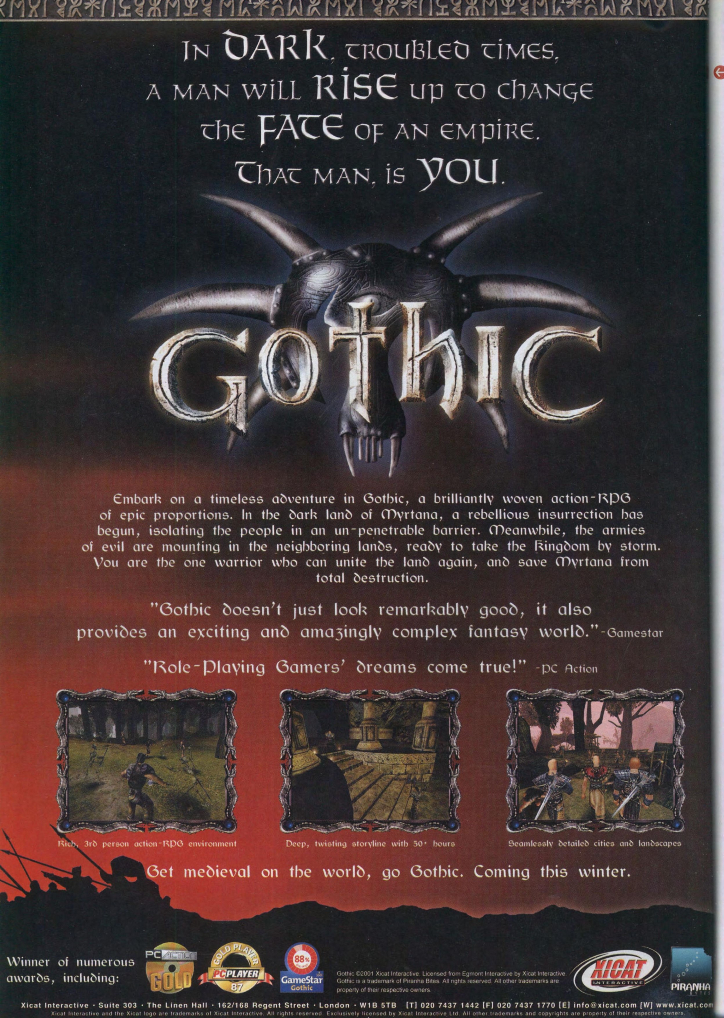 Man, this game is just flat out cool. Gothic is high adventure for anyone willing to take the trip, and a lengthy one too. At an estimated 100 hours of gameplay, you can consider yourself busy for the next several weeks. This title is a truly epic quest with excellent replayability. This game got under my skin so bad that I remember getting out of bed at 2:00am and going downstairs to play it. Any fan of RPGs or adventure should do themselves a favor and purchase this game. Sure, it has some minor issues, but they aren't anything that can't be overcome. This game rocks!