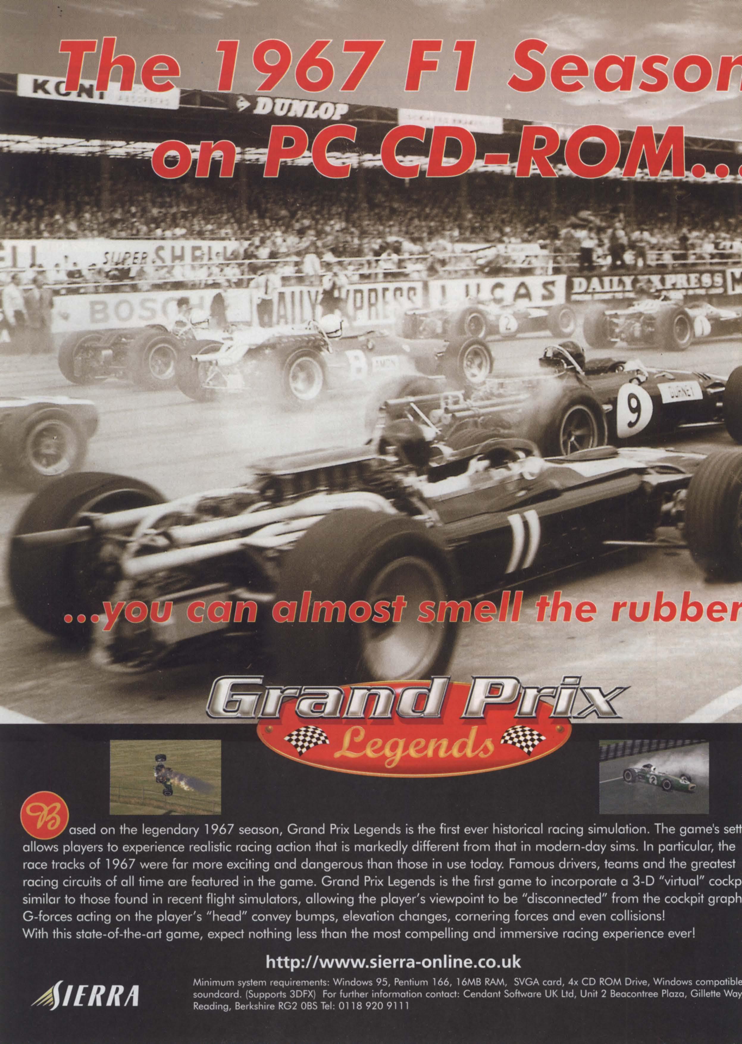Once upon a time, auto racing consisted of just that -- no beer commercials, no corporate sponsors, no aerodynamics -- just hard, fast, dangerous driving. Take a trip down memory lane to 1967, one of the most, if not the most, exciting years in racing history. Sierra Sports has teamed up with Papyrus (developers of NASCAR 2 and Indianapolis 500) to bring us their new historic racing simulation, Grand Prix Legends.