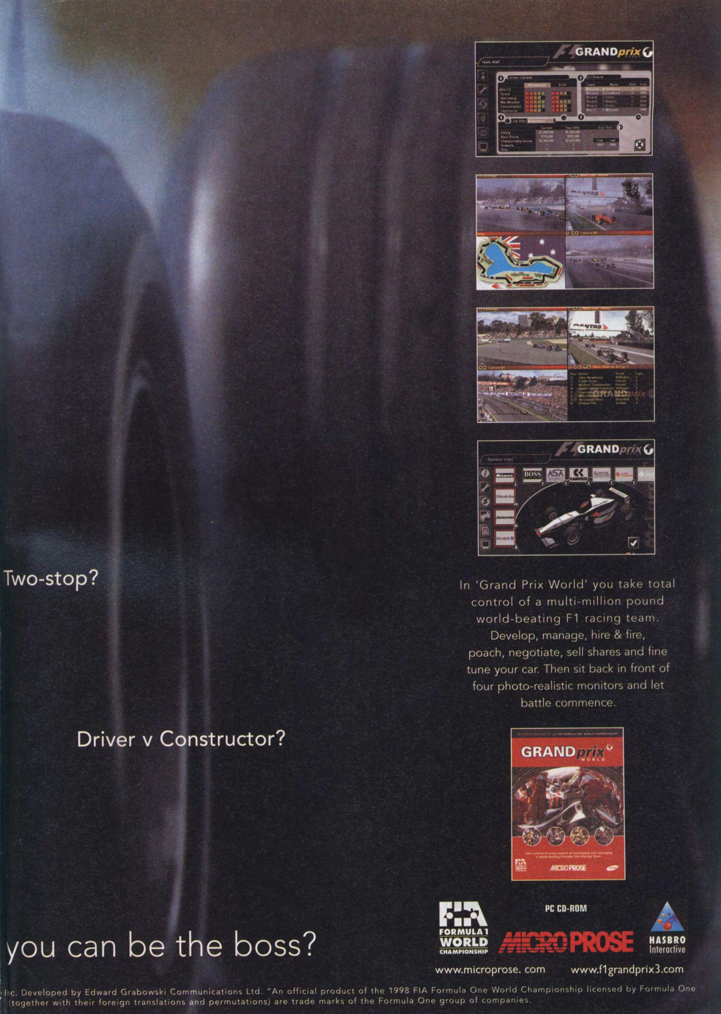 Anyhow, Grand Prix World concerns itself with managing an F1 team rather than driving for one, putting it in a field of exactly, er, one game. Sure, most of the driving sims allow you to tinker with the set-up of your car, but how many let you decide which catering firm to use at each race?