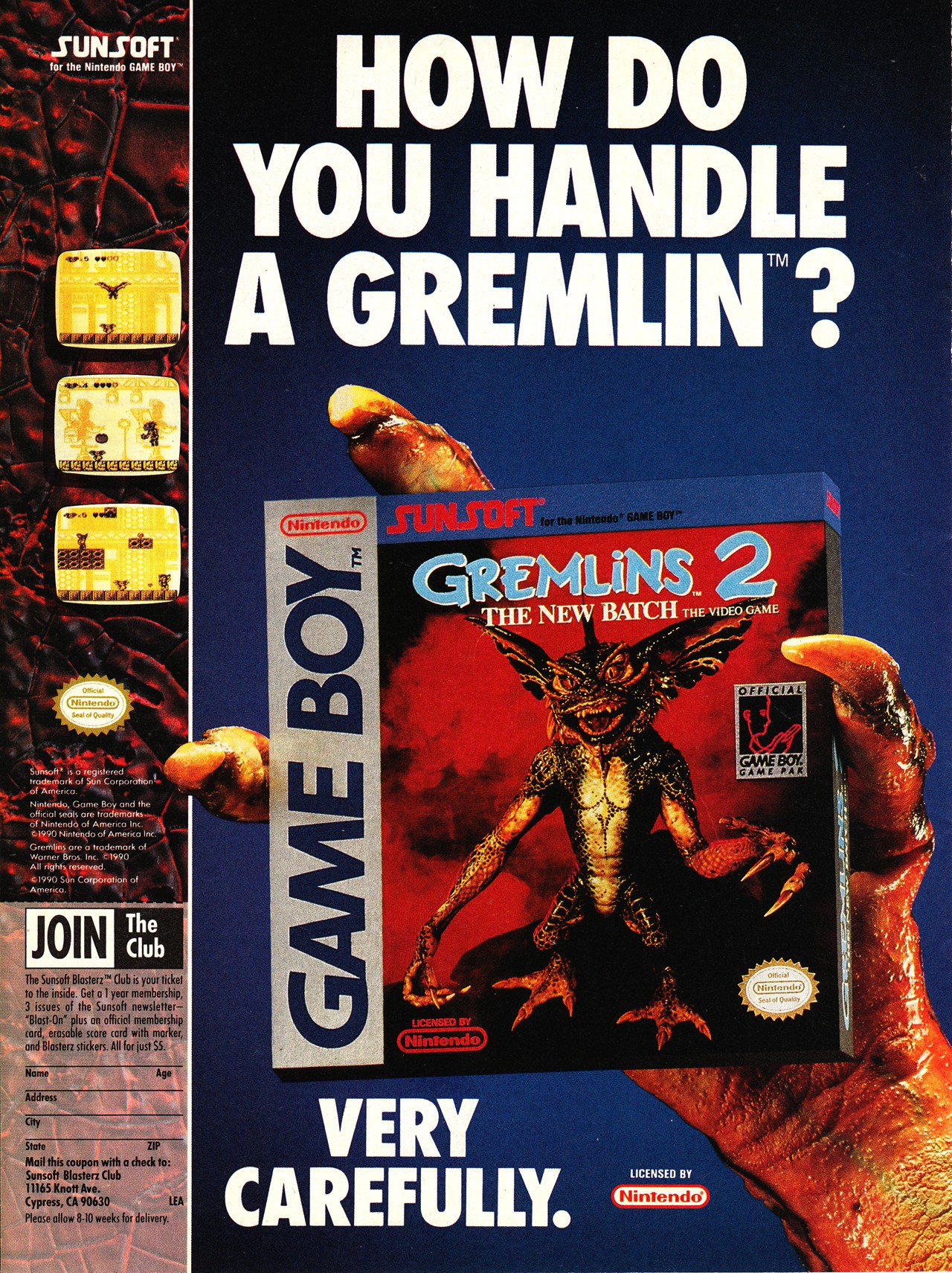 One of this summers box office hits, Gremlins 2. is coming to the stores this fall as a video game. SunSoft has taken furry little Gizmo and put him in the middle of a whole new batch of trouble! The game begins as Gizmo escapes from his cage in a genetics engineering lab. On his own in the towering Clamp office building. Gizmo must find his way to the safety of his long lost pal, Billy.