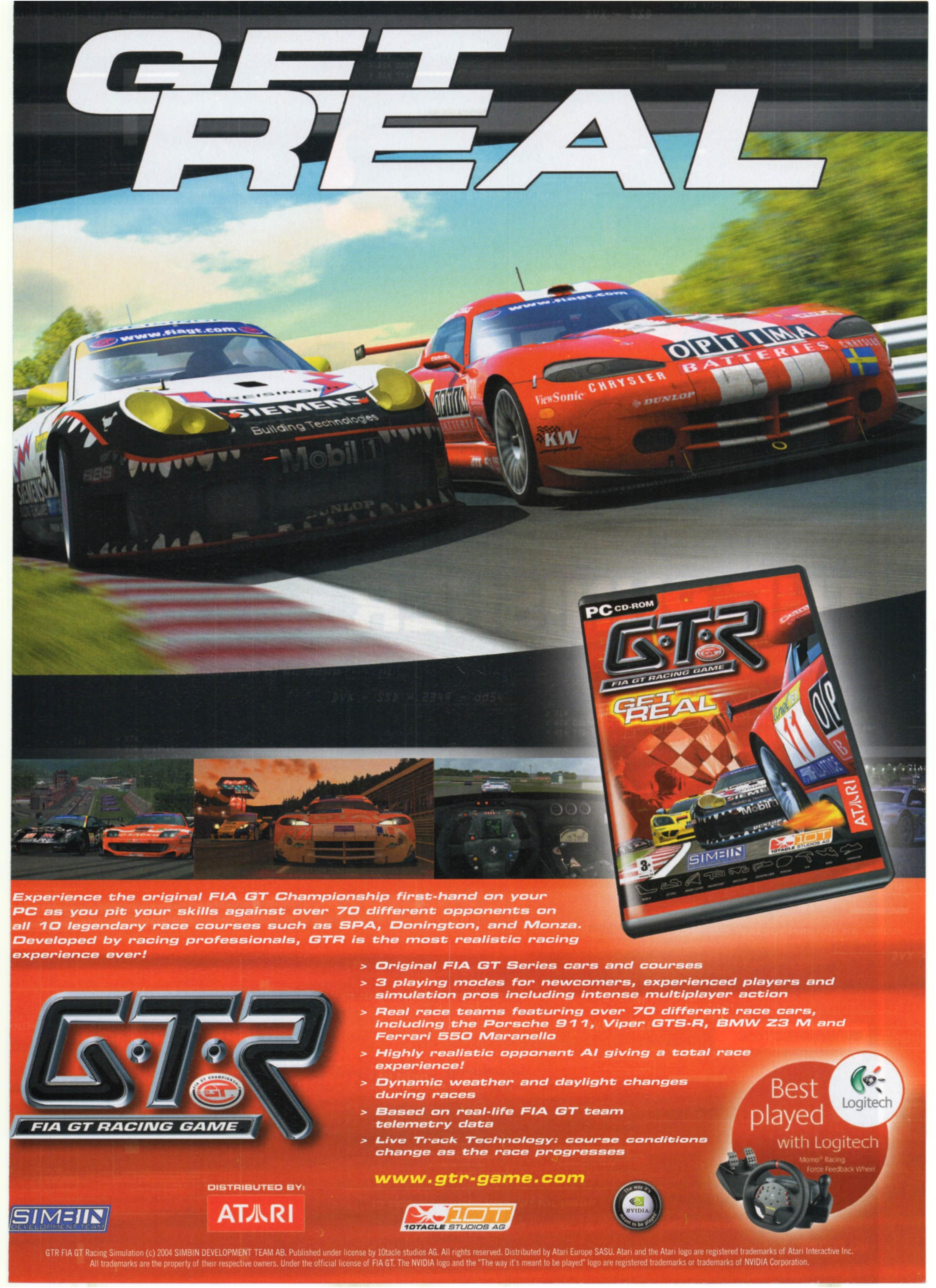 SimBin's efforts have faithfully recreated last season's FIA GT series in the game, from the names and liveries of the teams to the exact weather endured by the drivers. In terms of statistics, GTR offers over 70 choices of car from 18 different models, ten different tracks that have been accurately reproduced from a combination of GPS readings, CAD and telemetry, three different difficulty settings and a comprehensive Arcade mode.