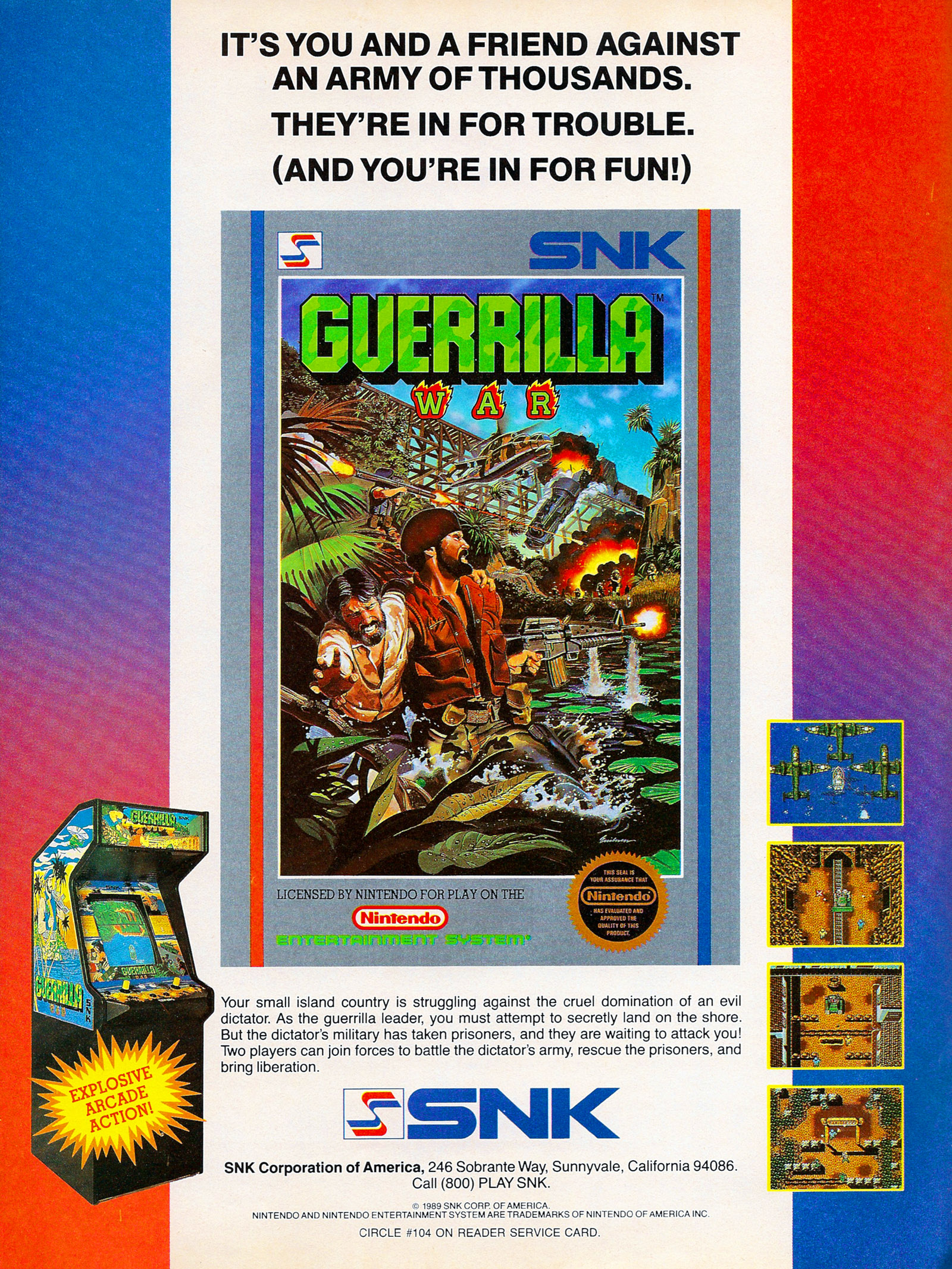 Guerilla War by SNK Electronics has excellent graphics and colorful scenarios with painstaking attention to detail. The continuous action scrolls smoothly and easily. The background music for each designated area is not repetitious, but keeps pace with the intense feeling of the game. The special effects used to show the dramatic explosions of enemy vehicles are a definite plus. Guerilla War is sure to rate as one of the best action games to hit the NES shelves this year.