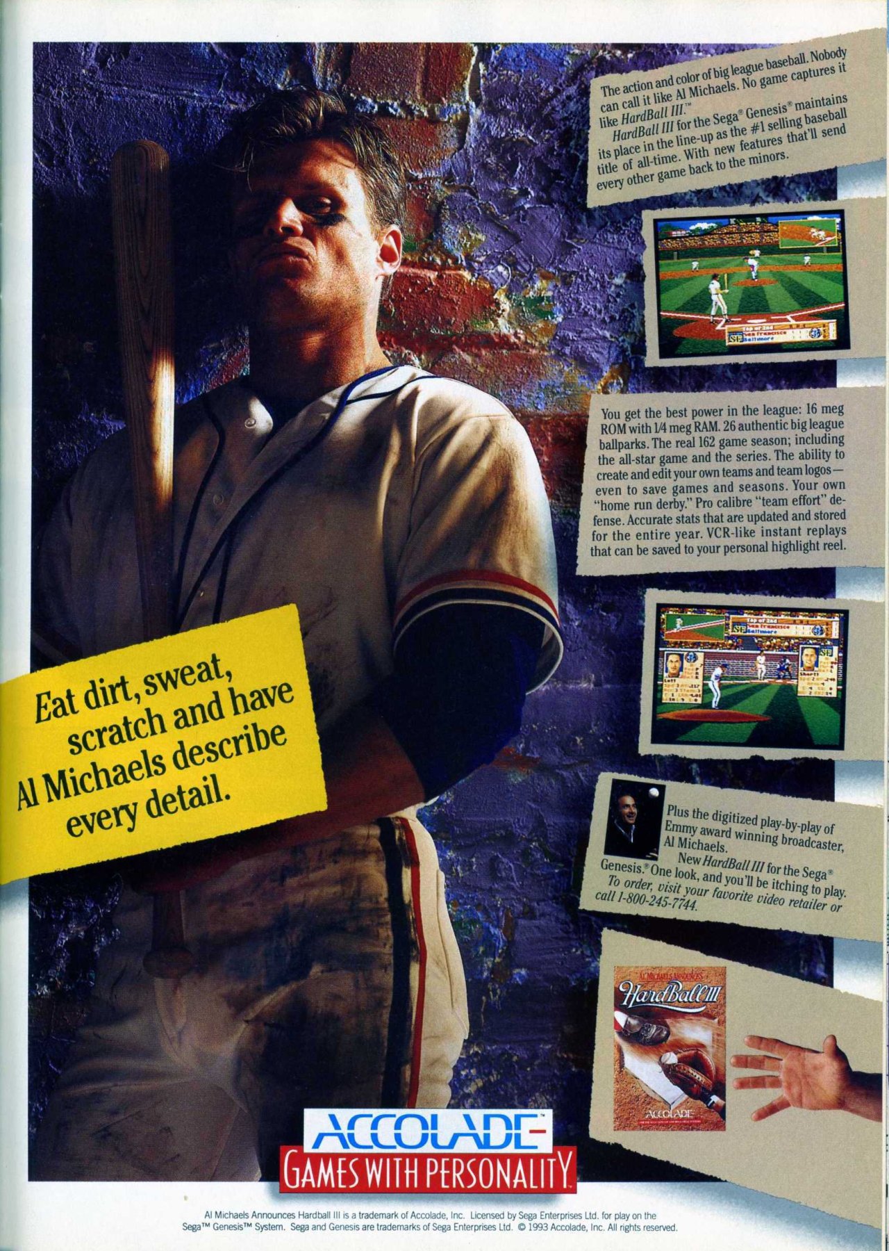 The latest version of Accolade's Hard Ball series still plays like a PC game, but this time you get some refined play-by-play by our man Al. The manner in which the words are pieced together is better than the Sega voice games, but it's still eclectic and without a solid game to support the effect it fails.