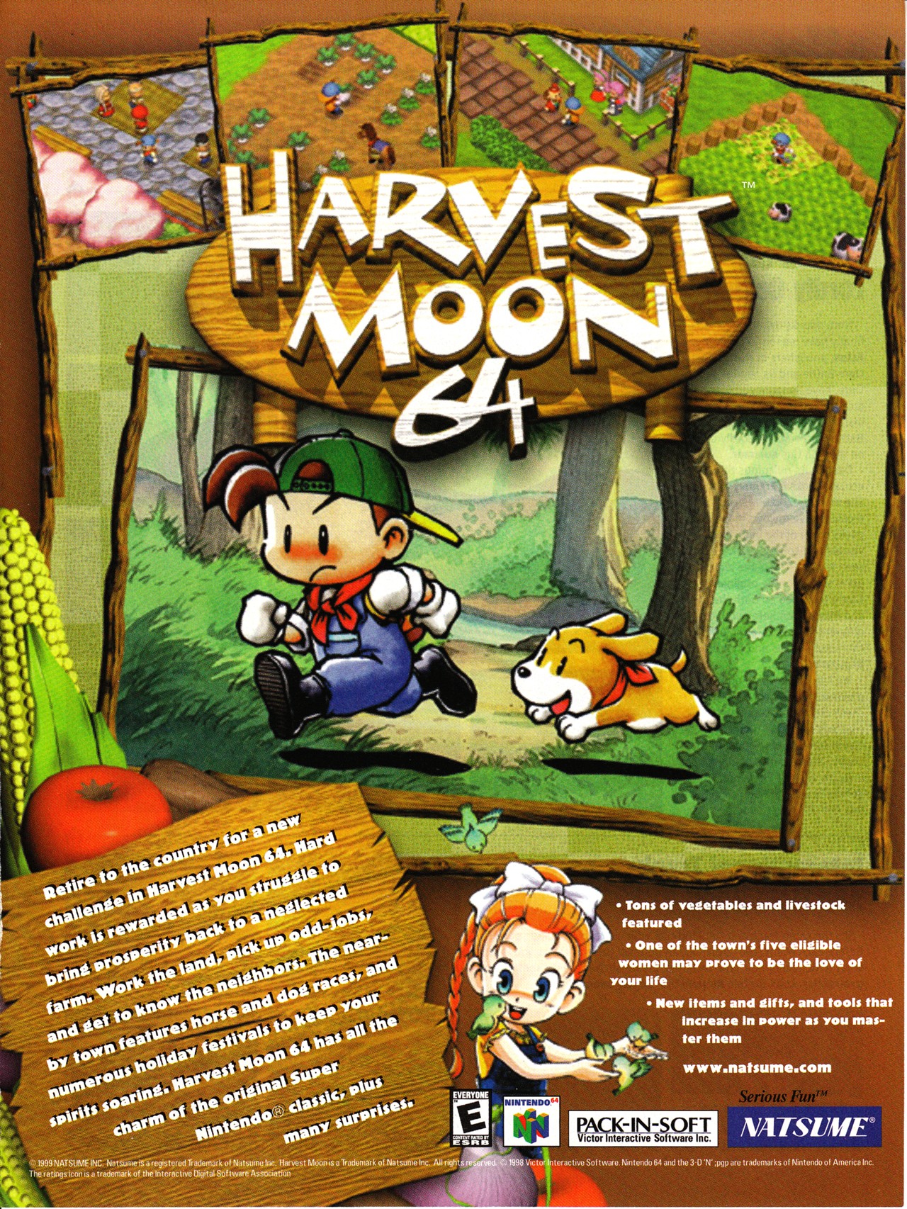 Harvest Moon 64 isn't like anything else you've seen on the Nintendo 64. It's a romance RPG and a farming simulation (yes, you read right...a farming simulation). As a young boy who just inherited your grandfather's farm, you must...ummm...farm and make a living for yourself. A typical day starts off like this: Go into town, buy some seeds (appropriate for the season at hand), go back, clear some land, till the soil, plant seeds, water seeds, then go to sleep. If you take care of your crops properly, they'll soon be ready for harvest. Now, sell the corn, potatoes or whatever, and make some cash! With the new dough, you can buy more seeds, different farm equipment and even livestock for bigger and better profit (you can sell a cow's milk or a chicken's eggs or a sheep's wool). And don't forget about the little things in video game farm life. Brush your horse regularly to keep him happy, and always bring the dog in when it's raining outside.