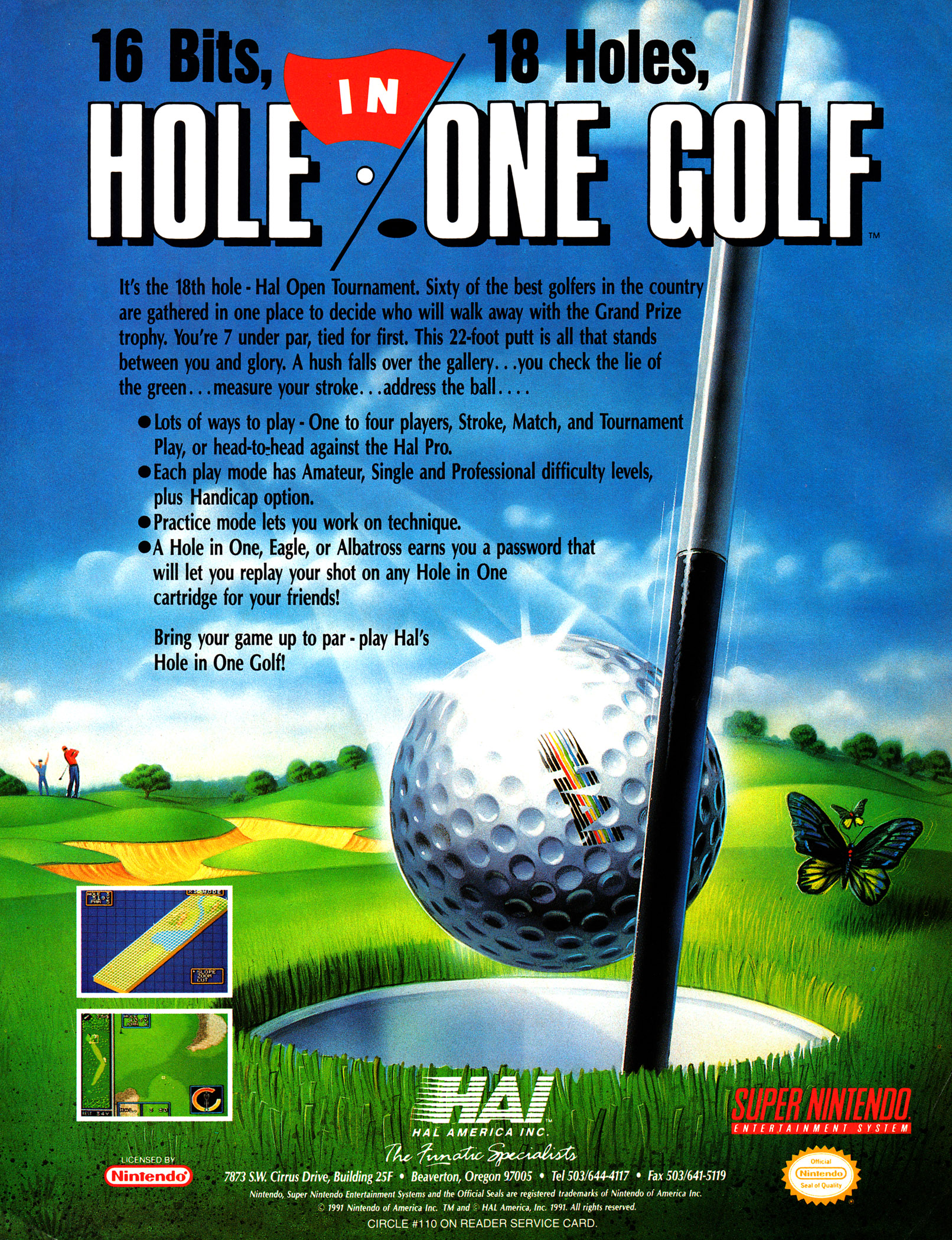 Hole In One Golf from HAL is the premier golf game for the Super NES. The game has a variety of features that make it one of the best golf simulations available. There is a huge selection of clubs and a full 18 holes to challenge the discriminating golf fan. Along with a great game of golf, Hole In One also takes advantage of the power of the Super NES hardware. Before you play a game you get a special overhead tour of the course ala Graphics Mode 7. In some of the more intense shots you'll even get a close up of the hole. All in all the graphics, music and game play make Hole In One a standard by which all other golf games will be judged.