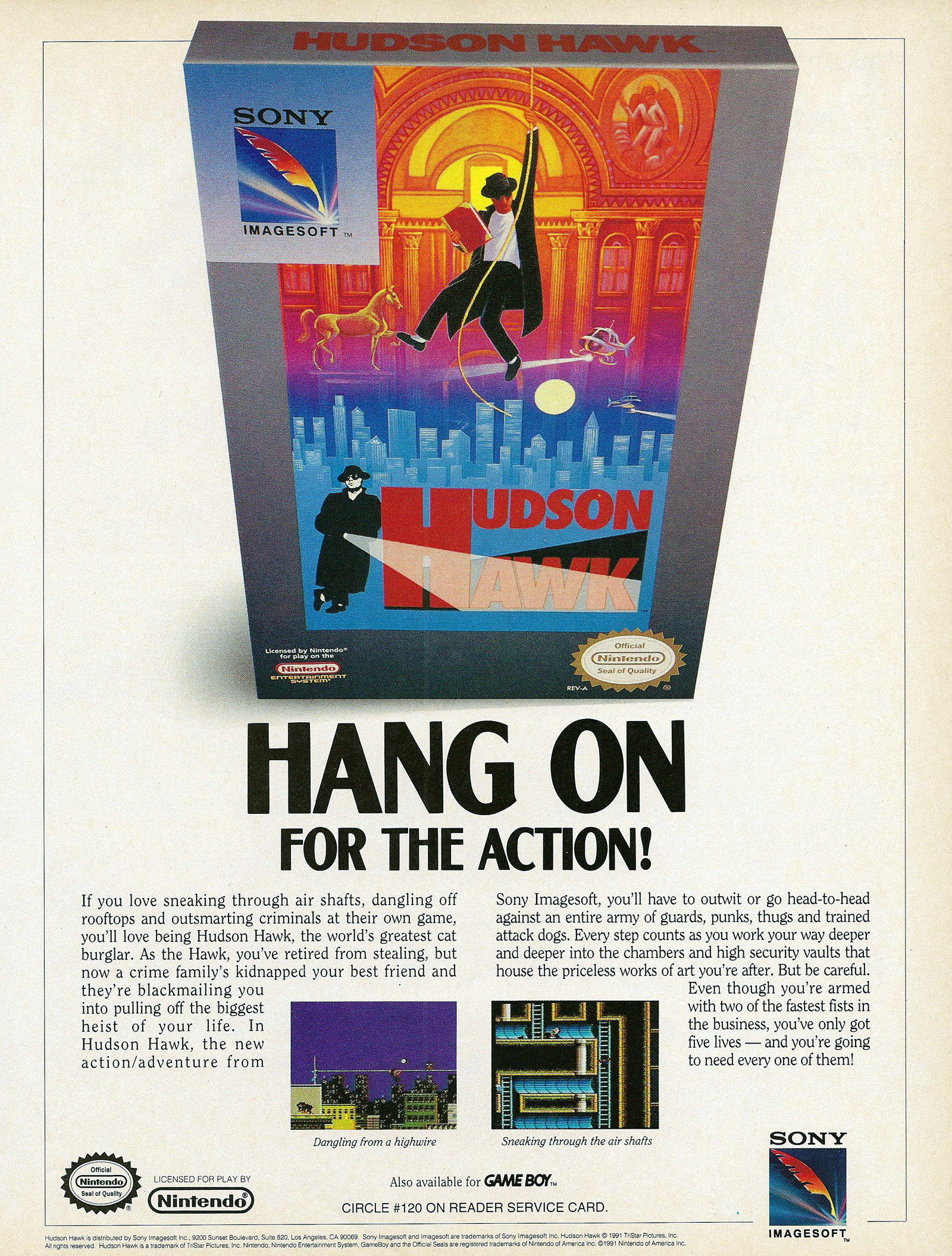 In Sony Imagesoft's "Hudson Hawk" for the Nintendo, you play Bruce Willis' character, "Hudson Hawk", searching for the artifacts while avoiding the police, the Mayflowers and other dangerous traps. You'll also have to deal with jumping across ravines and buildings throughout your quest.