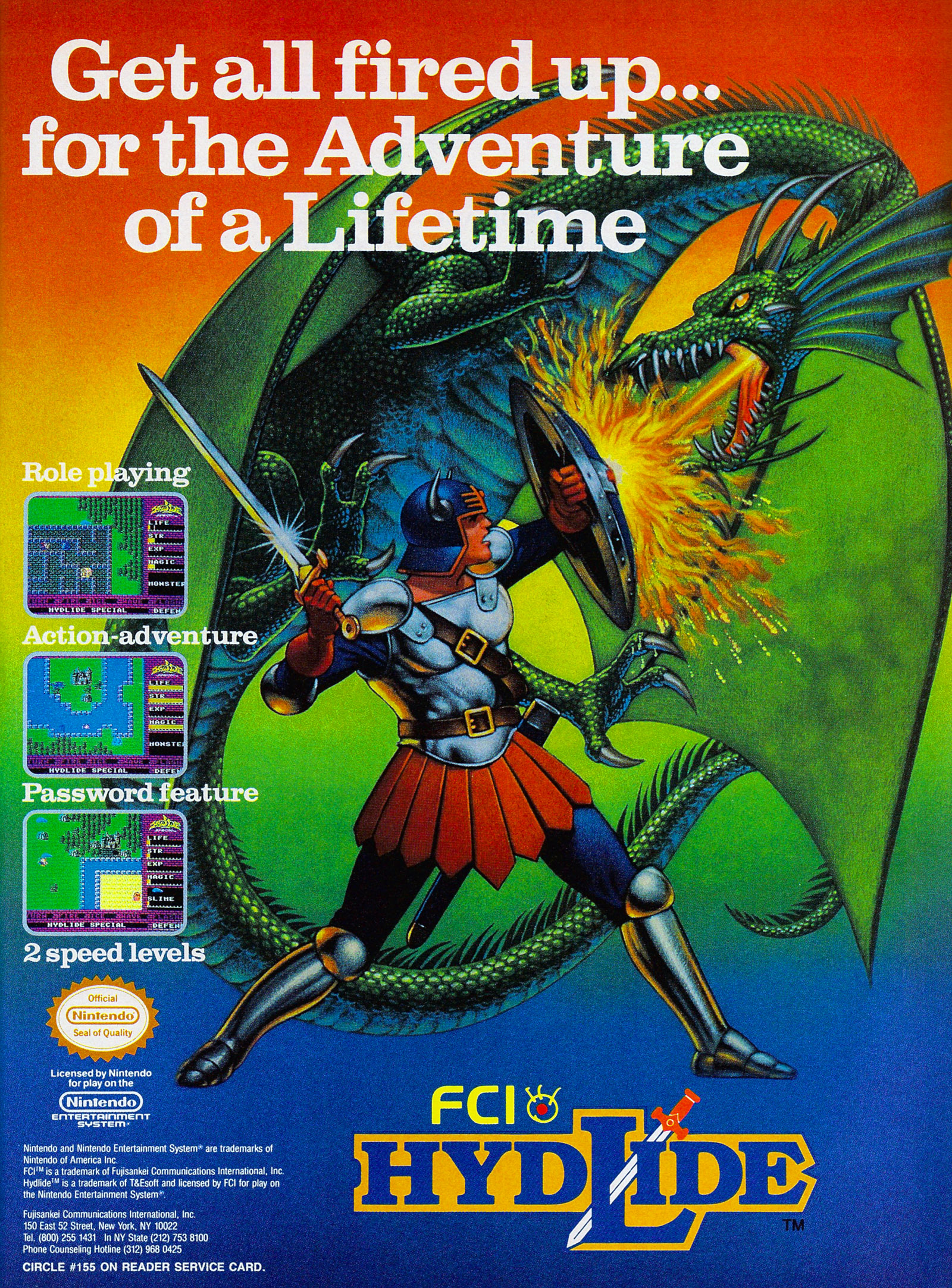 Hydlide is FCI's follow-up to the hugely popular RPG title, Ultima. Although Hydlide doesn't have much in common with Ultima, it does retain some of the same basic play elements and guarantees plenty of play value. You won't beat this one the same night you get it.