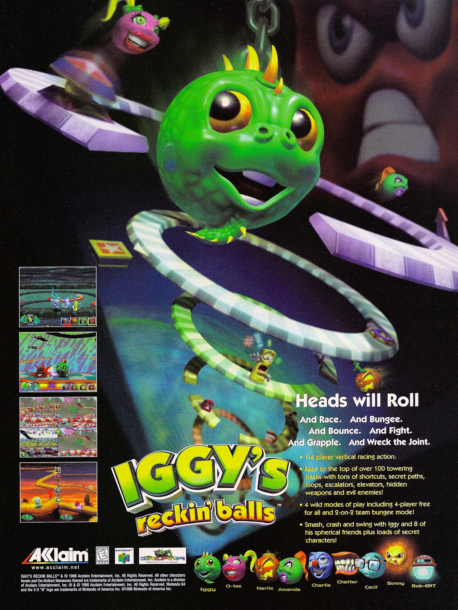 Acclaim chases after N64 multiplayer racing leaders such as Mario Kart with a unique whirlwind racer, Iggy's Reckin' Balls. Imagine you're a powered-up pinball zooming through a zany, kaleidoscopic world of circular roads, spinning ramps, and giant loops, and you're on the right track.