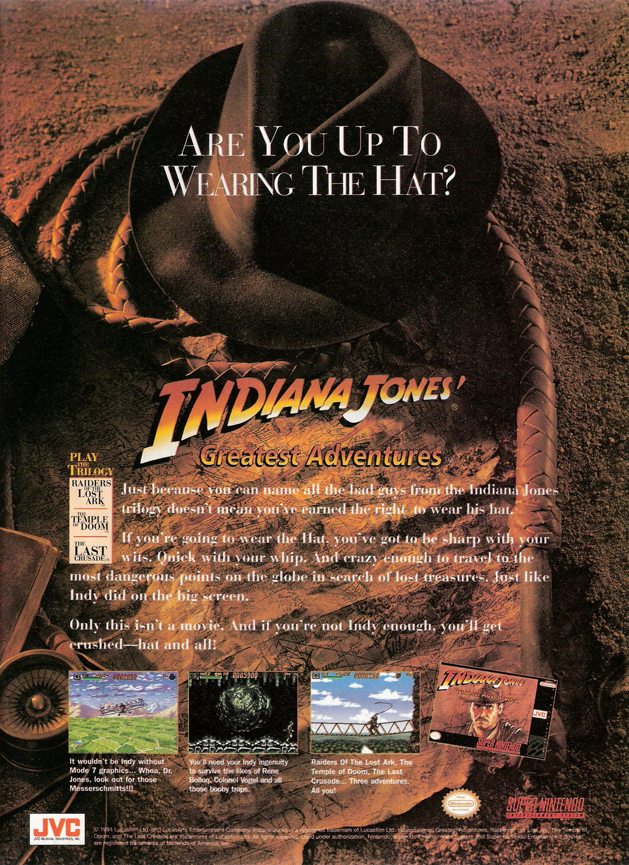 Indiana Jones' Greatest Adventures is a game based on the Indiana Jones trilogy released for the Super Nintendo Entertainment System in 1994, published by JVC Musical Industries, Inc and developed by Factor 5. The game is highlighted by selections from the John Williams score, and includes sound effects, digitized speech, and image captures during cutscenes. The title consists of platform levels from all three Indy films: Raiders of the Lost Ark, Temple of Doom, and Last Crusade. Players get to use Indy's trademark whip, as well as guns, grenades, and his fists to get through the game.