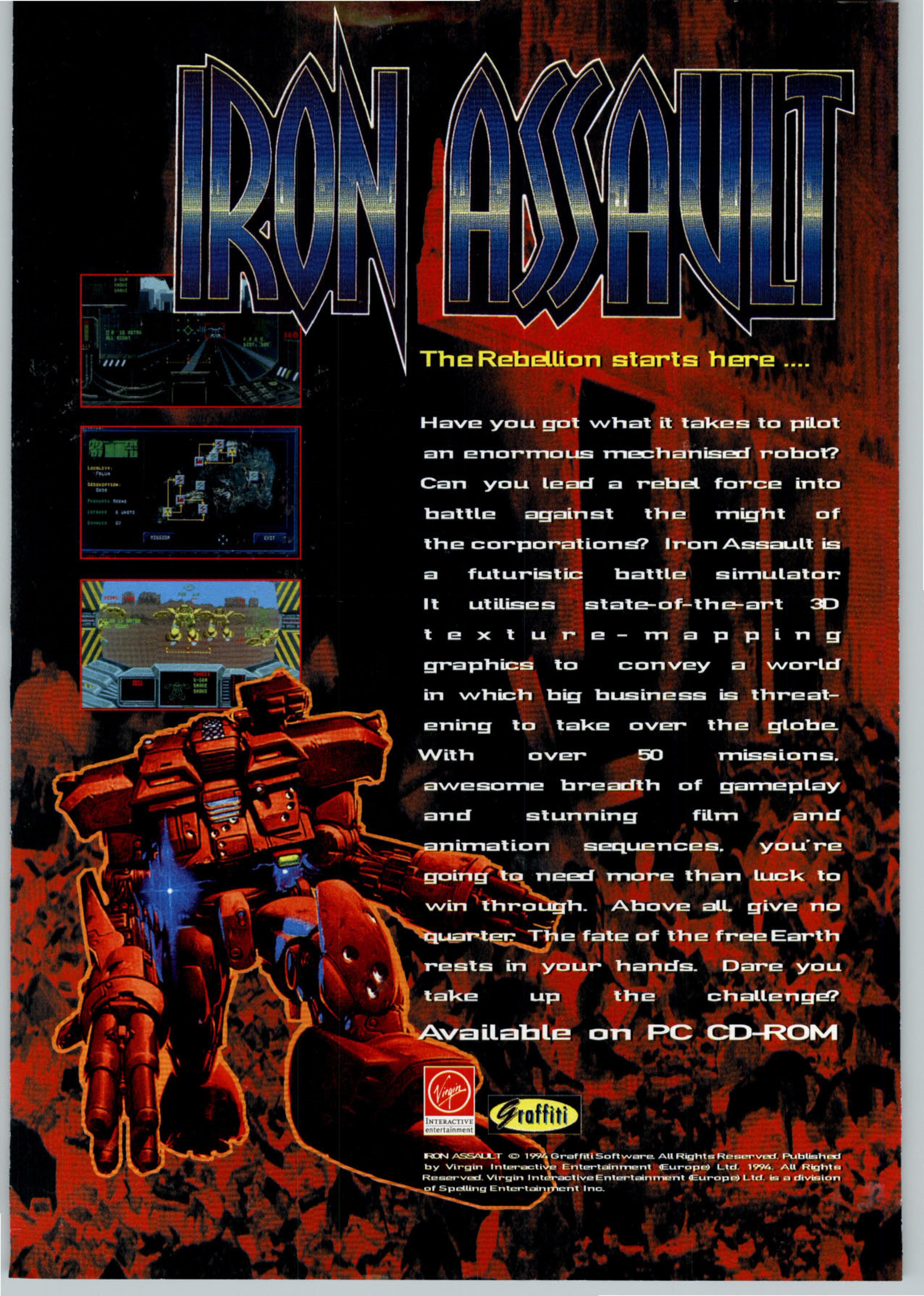 When Activision originally released Mechwarrior it was the first pc game to give you a first-person perspective viewpoint from the cockpit of a Battle mech (which is a sort of large robot you sit inside and shoot people with). Activision has been working on a sequel for some time now but that won't arrive until June or July this year. In the meantime, however. Sierr; have released barthsiege, which has a spookily similar concept to MechWarrior, and now we find that Virgin are getting in on the act with Iron Assault.