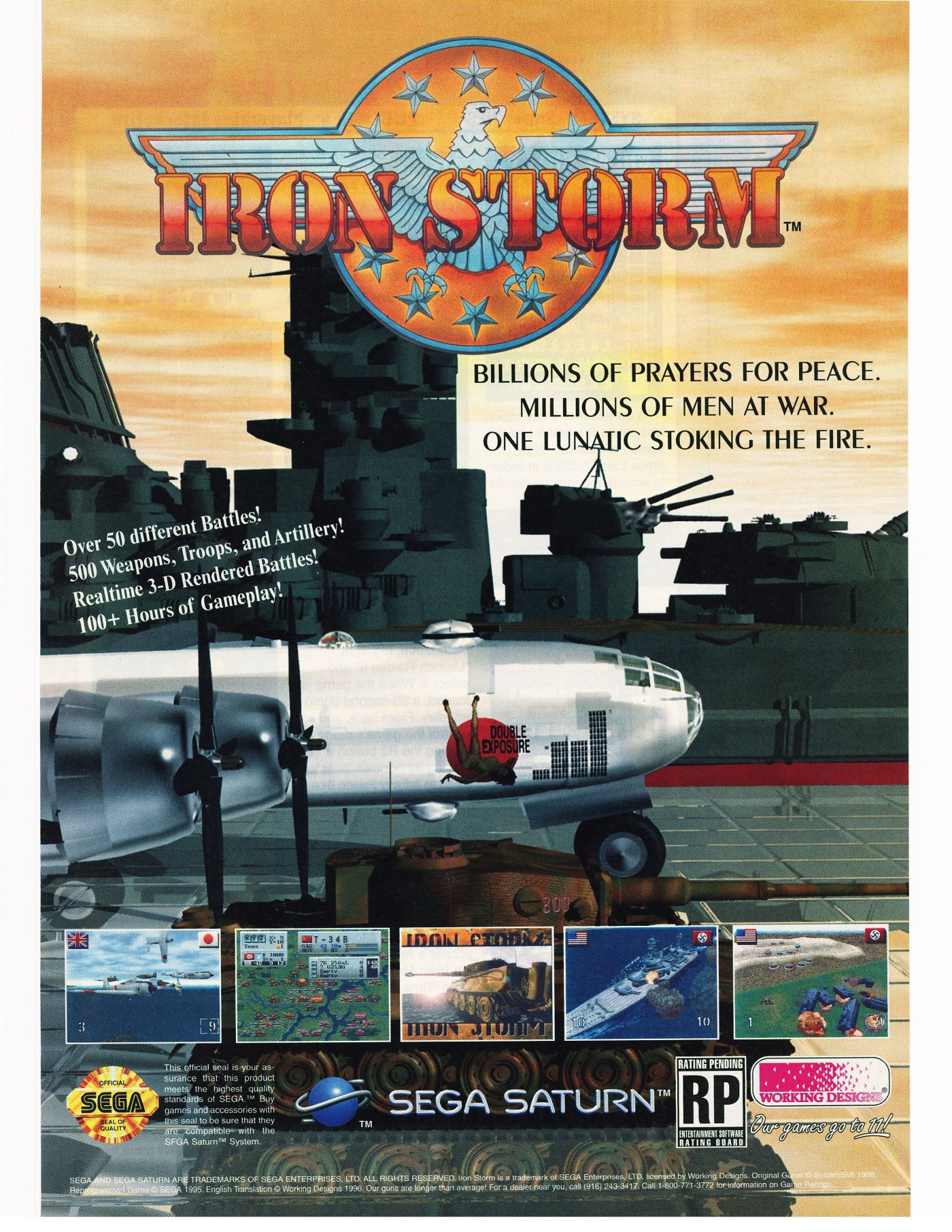 Iron Storm is Working Designs' first release for the Saturn system, and begins the company's thrust into the 32-bit market.This strategy game takes you back to World War II and allows you to control the destiny of the world! You can choose between Japan, America or Germany to command or play set battles. Historically accurate and graphically stunning, Iron Storm is one game Saturn owners won't want to miss. I'll have a review of this massive game next month, but rest assured, you won't be disappointed if you pick it up before then.