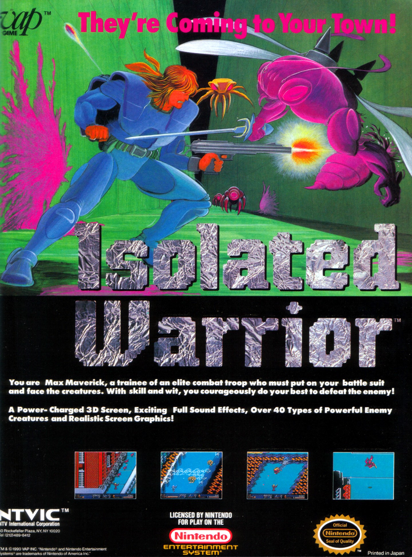 It's a diagonally scrolling action-adventure game packed with 6 difficult levels of alien-bashing fun. Finish the 6th level and get ready for a special seventh level meant only for the very best player! With a password feature to allow you to continue where you left off, Isolated Warrior offers the type of game play that will challenge even the better players