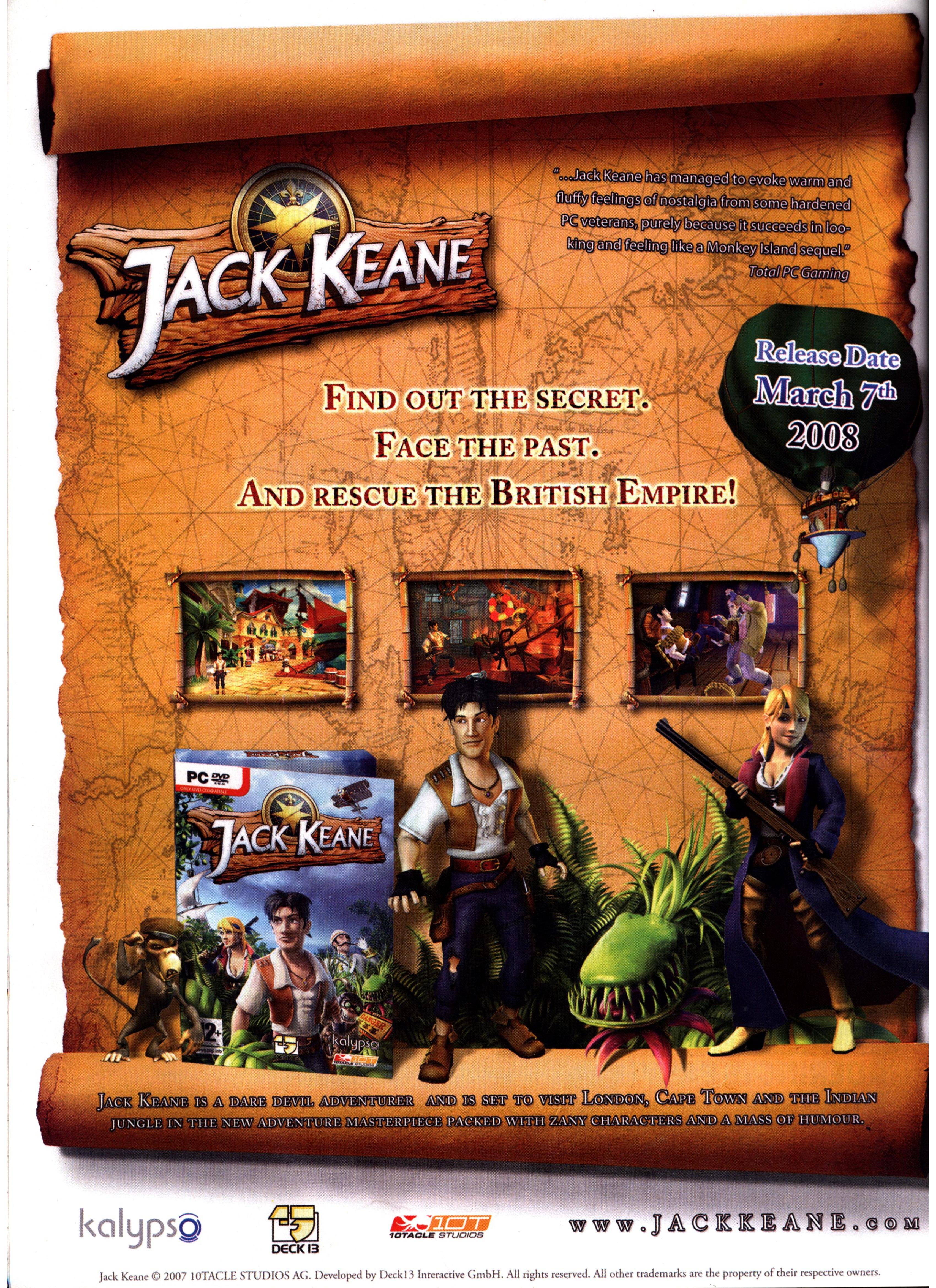 I Made a promise to myself and to you, dear reader, that I'd never do it. I'd never compare a point-and-clicker to The Secret of Monkey Island, or any other LucasArts adventure. Ulis is lazy and obvious games journalism, and in any respect, LucasArts' early '90s output was so polished that it only leads to unfavourable comparisons. But then along comes a game like Jack Keane that practically comes with a 'Wish You Were Here' postcard of Monkey Island stapled to the box.