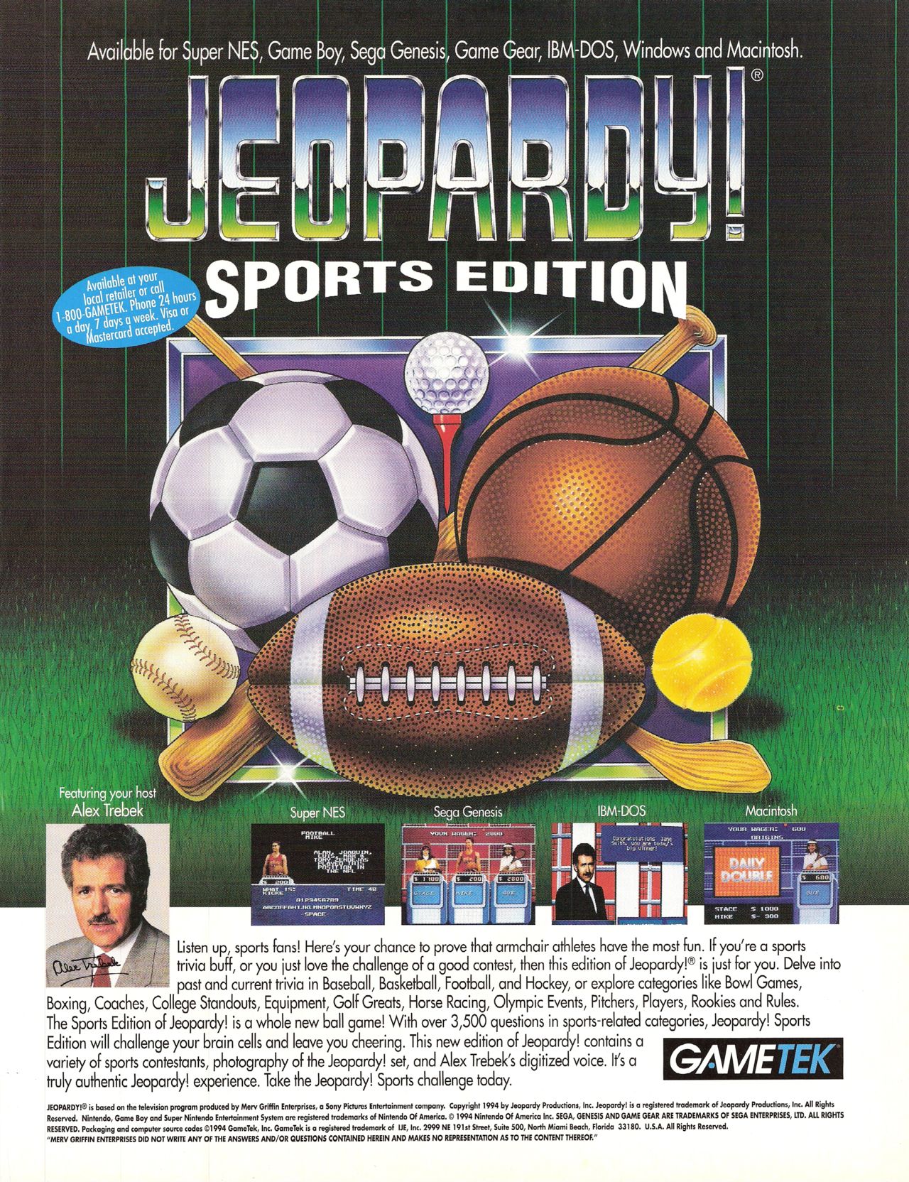 The Sports Edition of Jeopardy! is a whole new ball game! With over 3,500 questions in sports-related categories, Jeopardy! Sports Edition will challenge your brain cells and leave you cheering. The new edition of Jeopardy! contains a variety of sports contestants, photography of Jeopardy's set, and Alex Trebek's digitized voice. It's a truly authentic Jeopardy experience. Take the Jeopardy! challenge. Good luck!