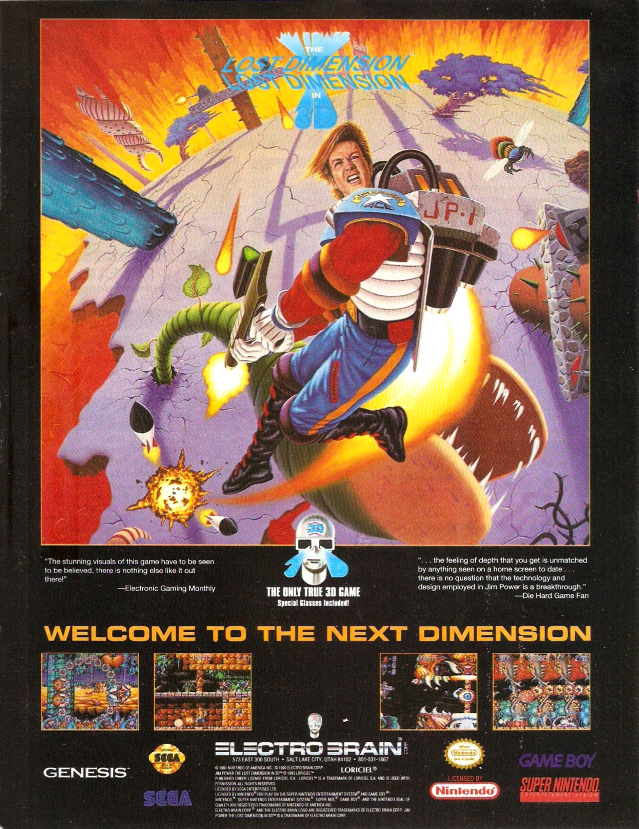 Jim Power: The Lost Dimension is a side-scrolling platform game, a side-scrolling shooter and a top-view shooter game depending on the level published by Electro Brain for the Super NES in 1993 and designed by French developer Loriciel. Several other systems, including Amstrad CPC, Amiga, Mega Drive/Genesis, PC (DOS), have versions of the game. The game features several contrasting modes of gameplay, including side-view platforming, horizontal shoot 'em up , and also top-view. He must find fight enemies, bosses and obtain various keys to progress through the levels.