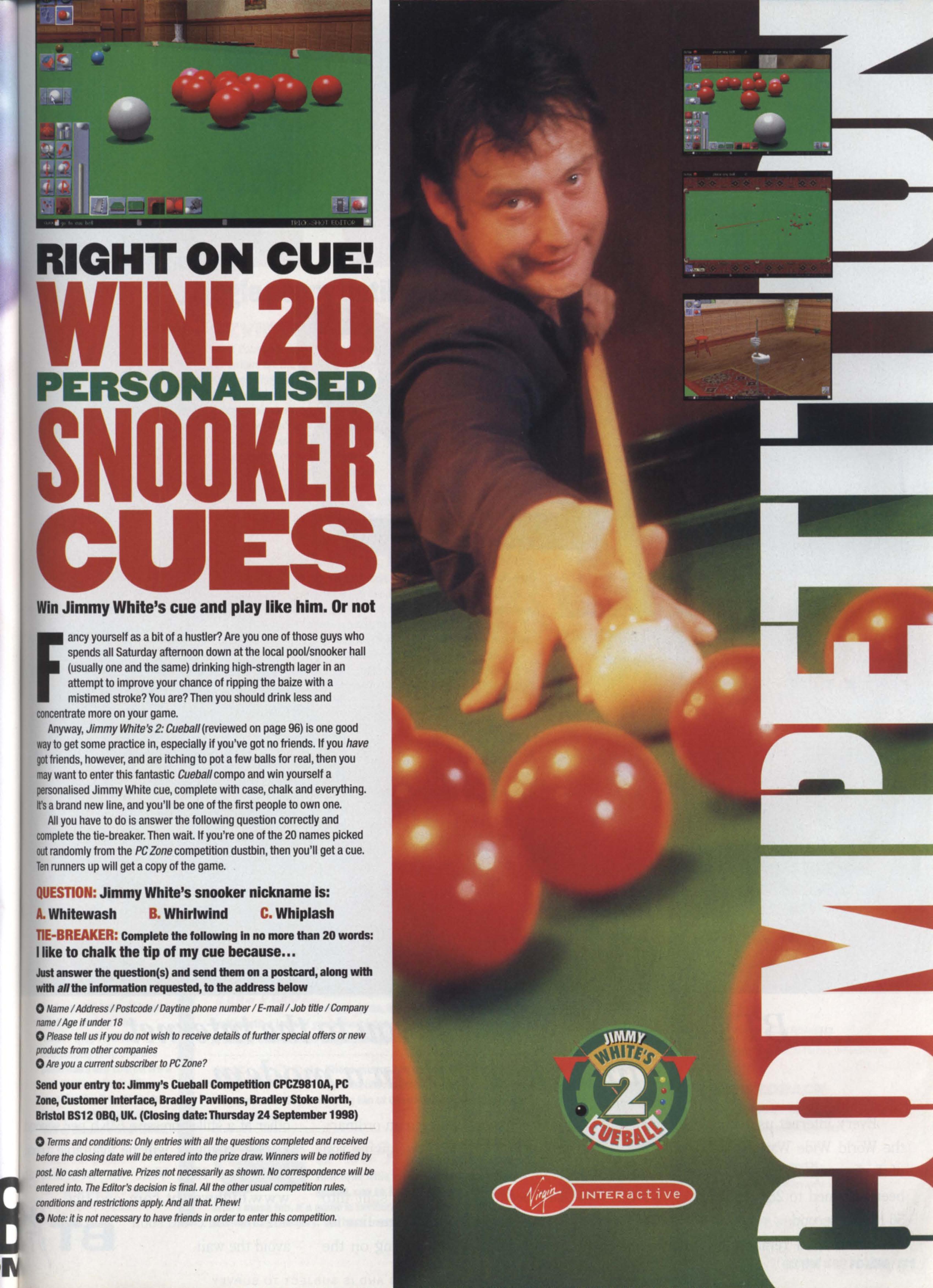 The important thing to note is that home alone, Cueball isn't one of those games that will keep you up all night. Forthat you'll also need a stack of beers and a couple of mates. But it's certainly one of those games that you could just jump in for a quick frame or two when you've had enough of Quake or Puzzle Bobble.