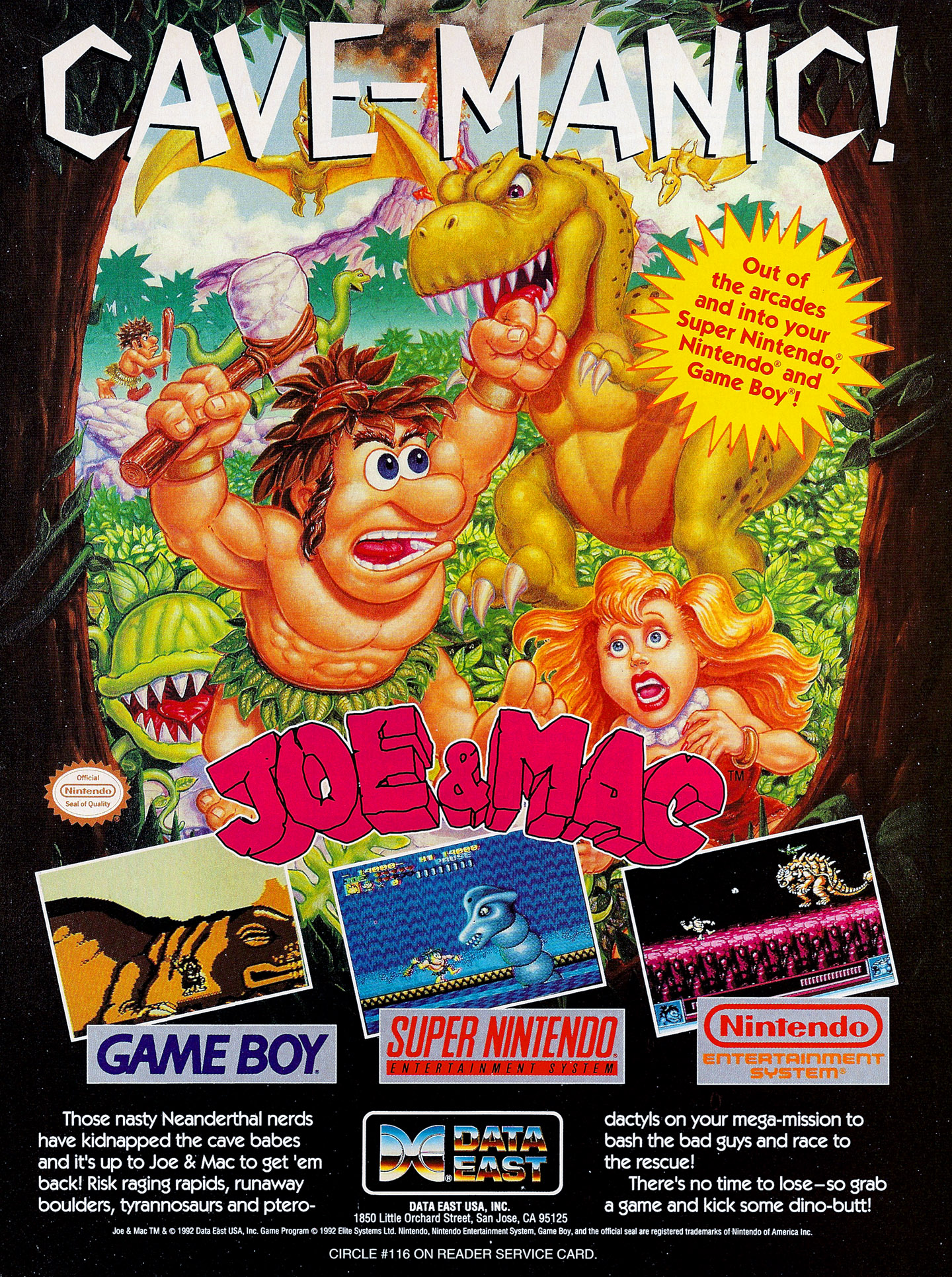 Joe & Mac are two cave dudes that gotta find their girl-friends - they've been kidnapped by evil neanderthals. Pick up your stone axes as you set off on a prehistoric rescue mission. Braving a wild and wacky world filled with flowing lava, rock slides, and more primordial monsters than you can shake a club at. Its true arcade action, with big, coin-op style graphics and the baddest two-player option ever.