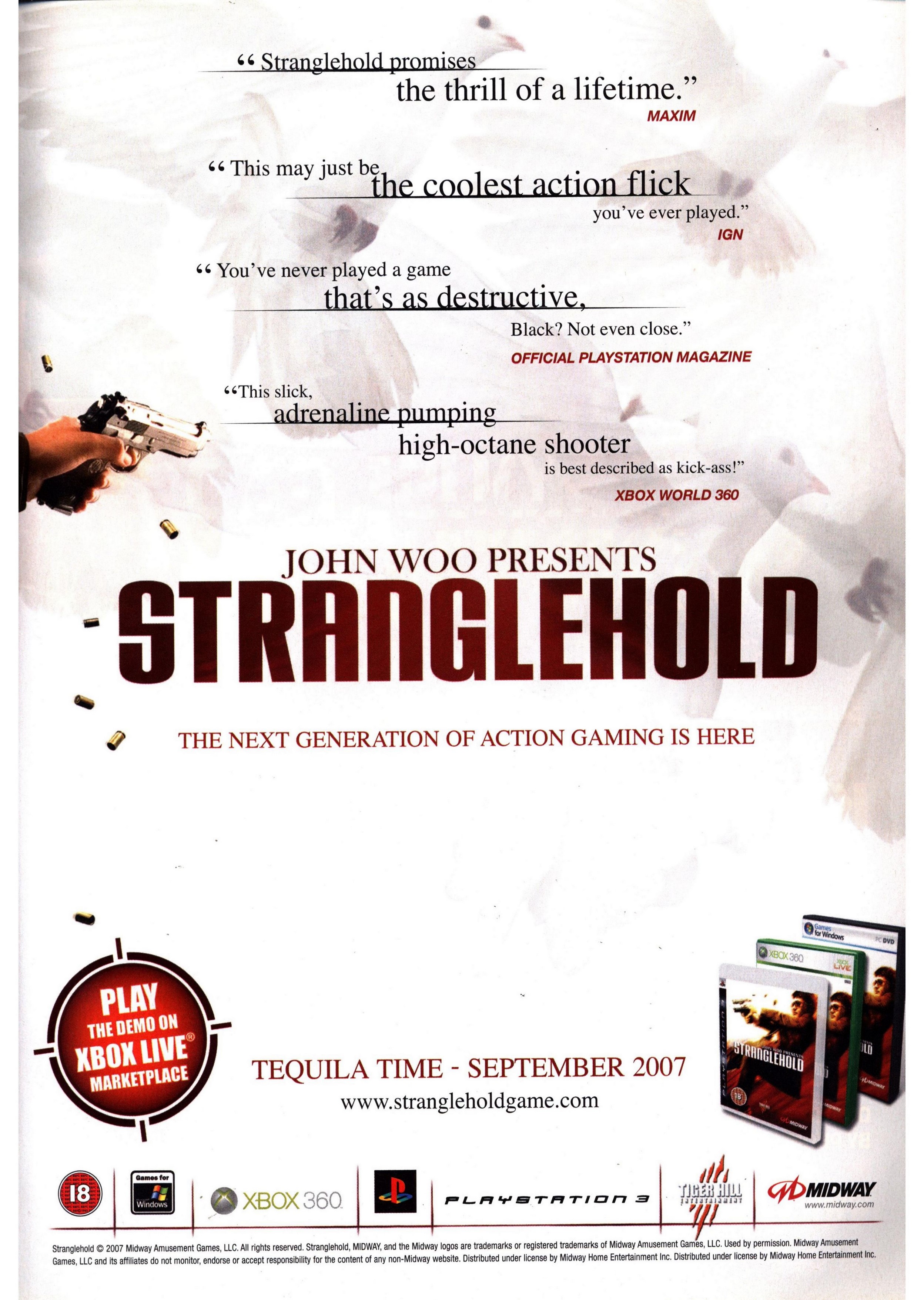 Too many third-person shooters today feature overly domestic gunplay, which is why Stranglehold's hoping to add some flavor with its foreign firefights. All the action mimics blockbuster movie director John Woo's signature style: excessive use of slow motion, double-packing pistols, and even those damn white doves. Stunts such as hanging off chandeliers and sliding down banisters also help make this game rock with its guns cocked.