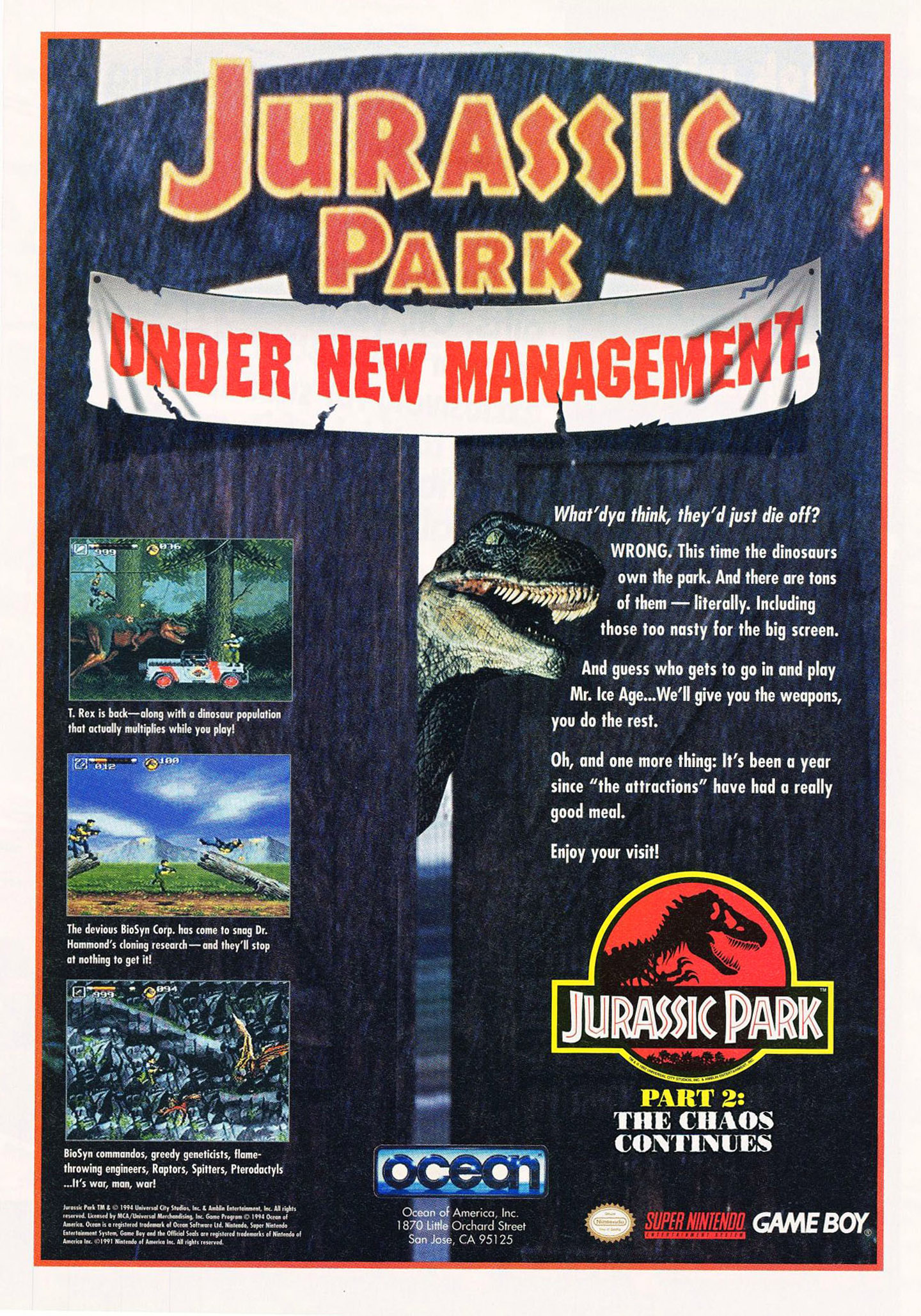 Jurassic Park II is a side-scrolling adventure with really cool levels using the Super NES's special effects. The opening cinema is great. It's animated, and even has a clear-sounding voice. The audio is in Dolby SurroundSound. The graphics are great and are a vast improvement over the first cart. JP2 is an adventure like no other.