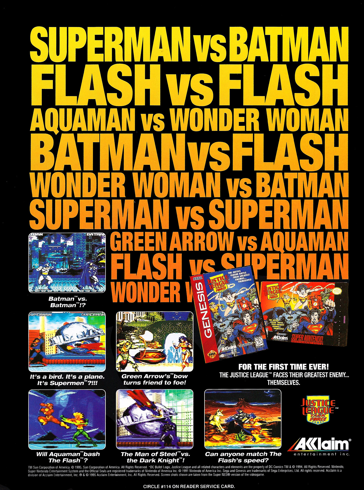 Where else can Superman and Wonder Woman battle it out against each other? Acclaim's new fighting game lets you see it happen on your Genesis. But you may find that the scales of justice tip more toward the computer than toward you.