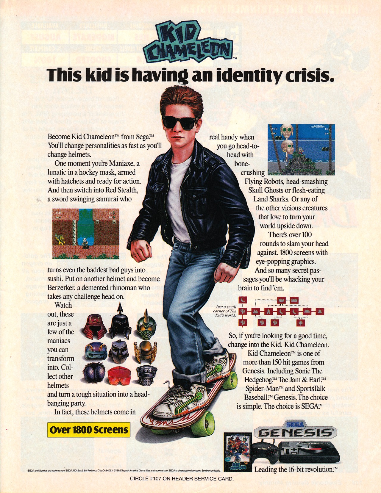 Kid Chameleon is a radical dude who's on a trip through more than 100 levels of forests, mountains, islands, and underground volcanoes -- each with secret passages and areas. This kid uses his head, err... actually his hats or helmets to make his adventure easier. Each of the different helmets he dons changes him into a different creature. As Rhino-Head he smashes through walls. When he's Skull Crusher he shoots skulls. As the Samurai he slashes anything that gets in his way! Now that's a head trip!