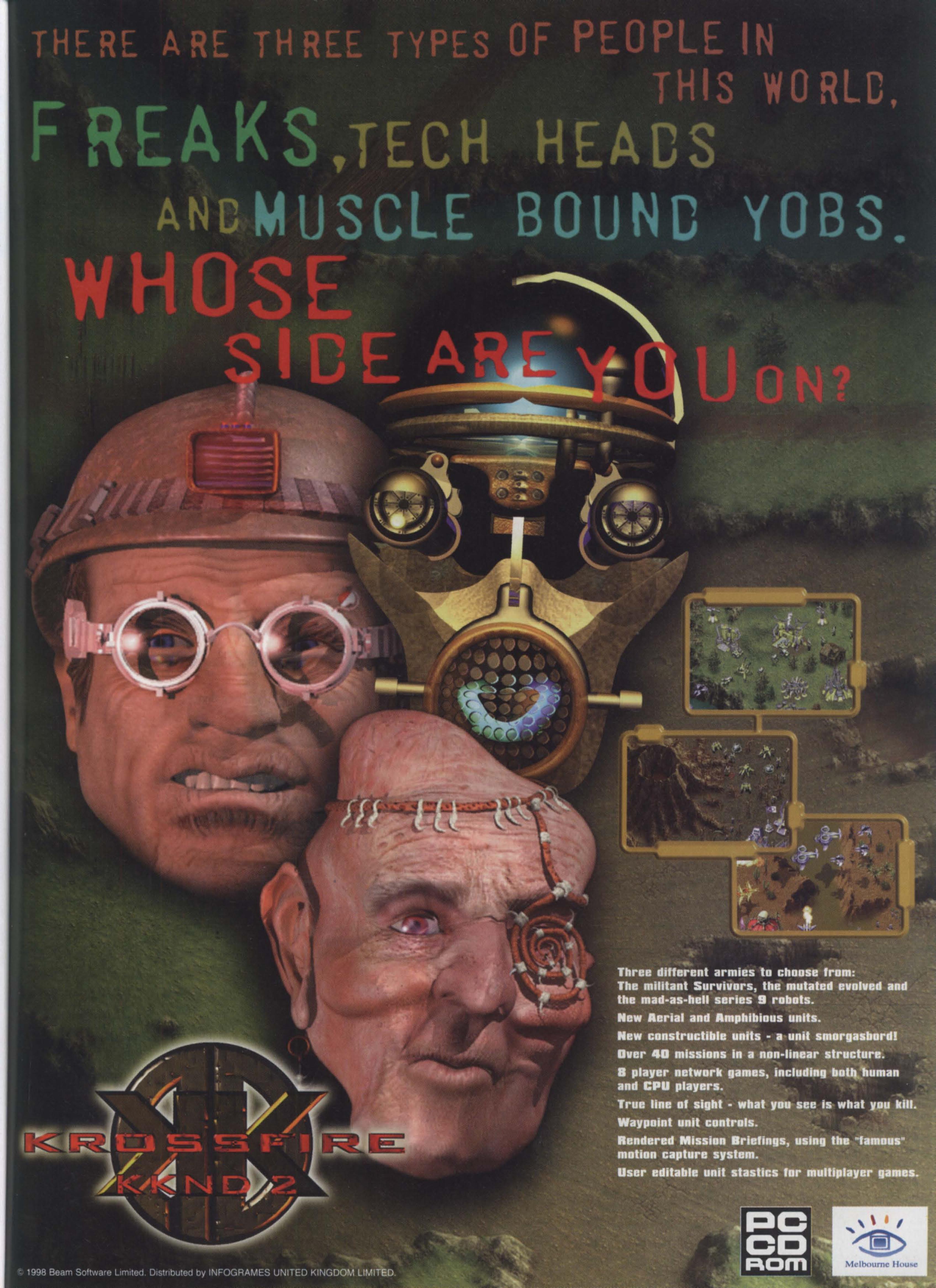 KKND2: Krossfire (the sequel to Krush, Kill 'N Destroy) is yet another spin on the familiar real-time strategy (RTS) game popularized by hits like Warcraft and Command & Conquer. In KKND2 you get to choose from one of three warring factions: the Survivors, Evolved, or Series 9 robots.