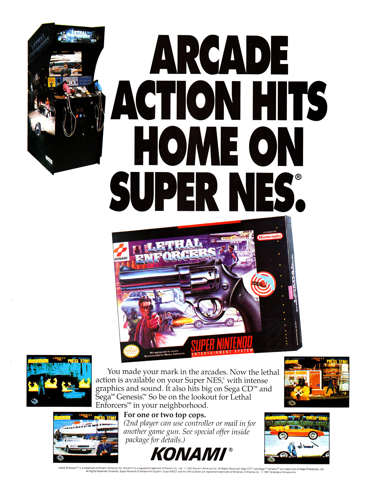 You've been warned! Lethal Enforcers is a serious shoot-em-up game that puts the "gun" in SNES gun games in more ways than one. As a rookie cop you're out to stop an urban crime spree by cleaning out the scum from five murderous levels. Konami supplies the gun (called "The Justifier," bundled with the game), the game, and the criminals.