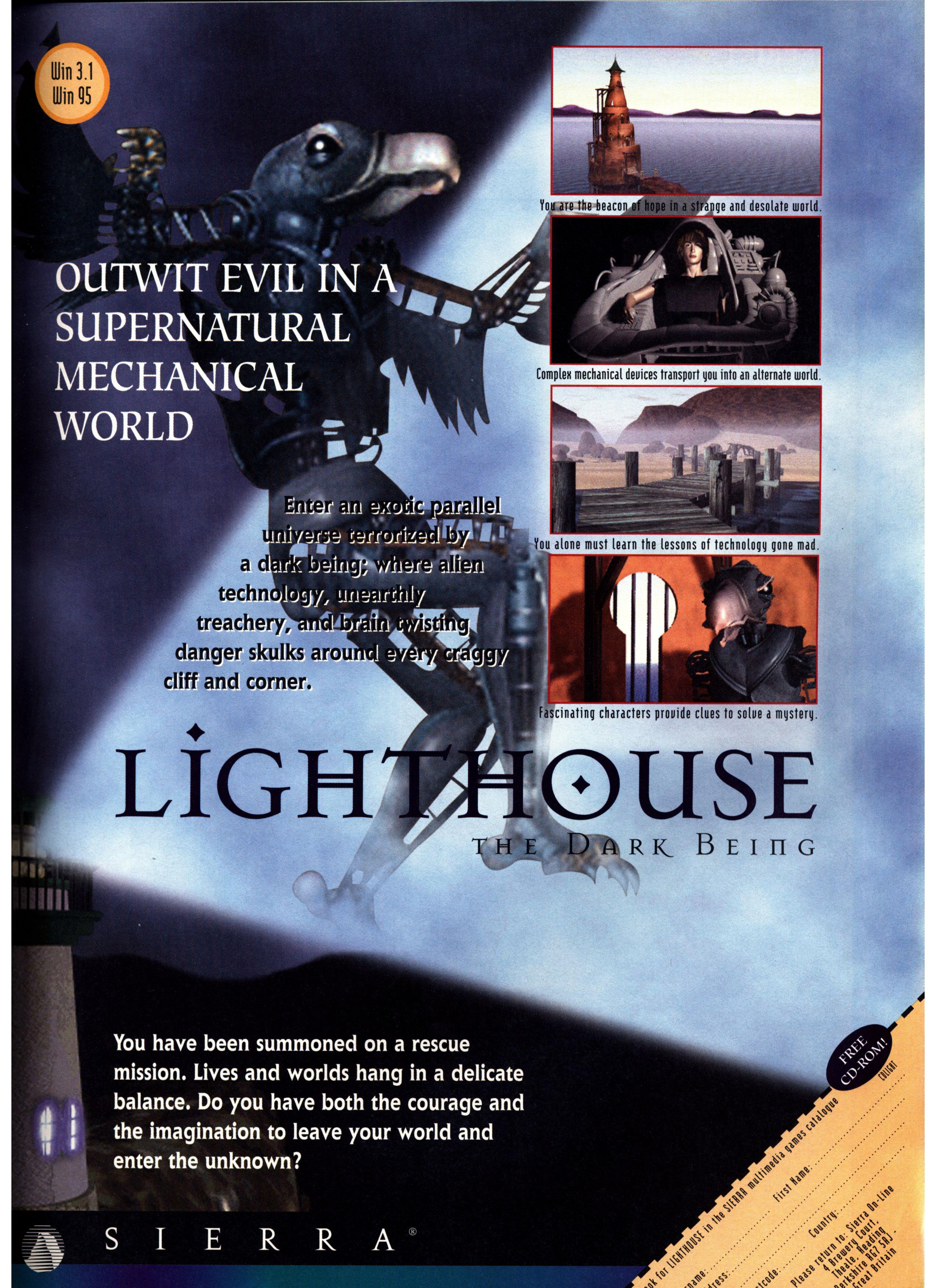 "Lives and worlds hang in the balance!" Are you up to the challenge? Then come on down and enter the strange, intriguing and sometimes maddening world of Sierra's Lighthouse. You are the summer neighbor of the eccentric lighthouse keeper, Dr. Krick, and his infant daughter, Amanda. Dr. Krick has found an alternate world, one that -- unfortunately -- is ruled by the "Dark Being." You are summoned by a mysterious phone call in the night to Dr. Krick's house. He seems to have vanished! You are relieved to see that Amanda is a little hungry, but otherwise fine. While you are looking around the house for clues to the doctor's disappearance, a weird creature comes and grabs Amanda, carrying her through a strange, glowing portal. Dare you follow? Only you can save Dr. Krick, Amanda, and of course, both worlds.