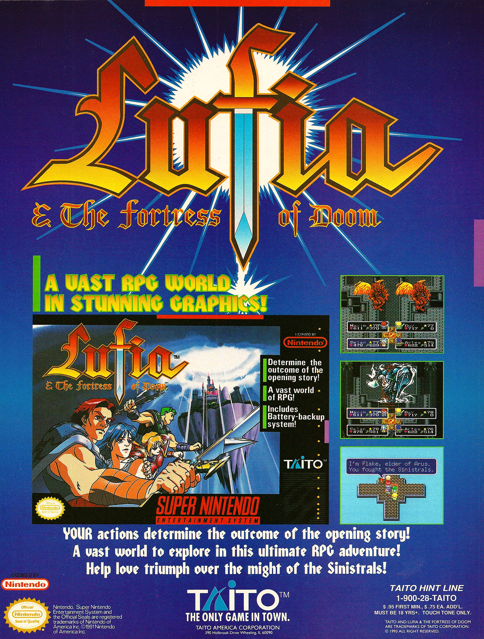 You may never have heard of it, but Taito has got a really great game on its hands. We've seen quite a few new RPGs recently, but none has been as enjoyable as Lufia & the Fortress of Doom. From its wacky, off-beat dialogue to its incredible size, Lufia just keeps getting better and better as you play it