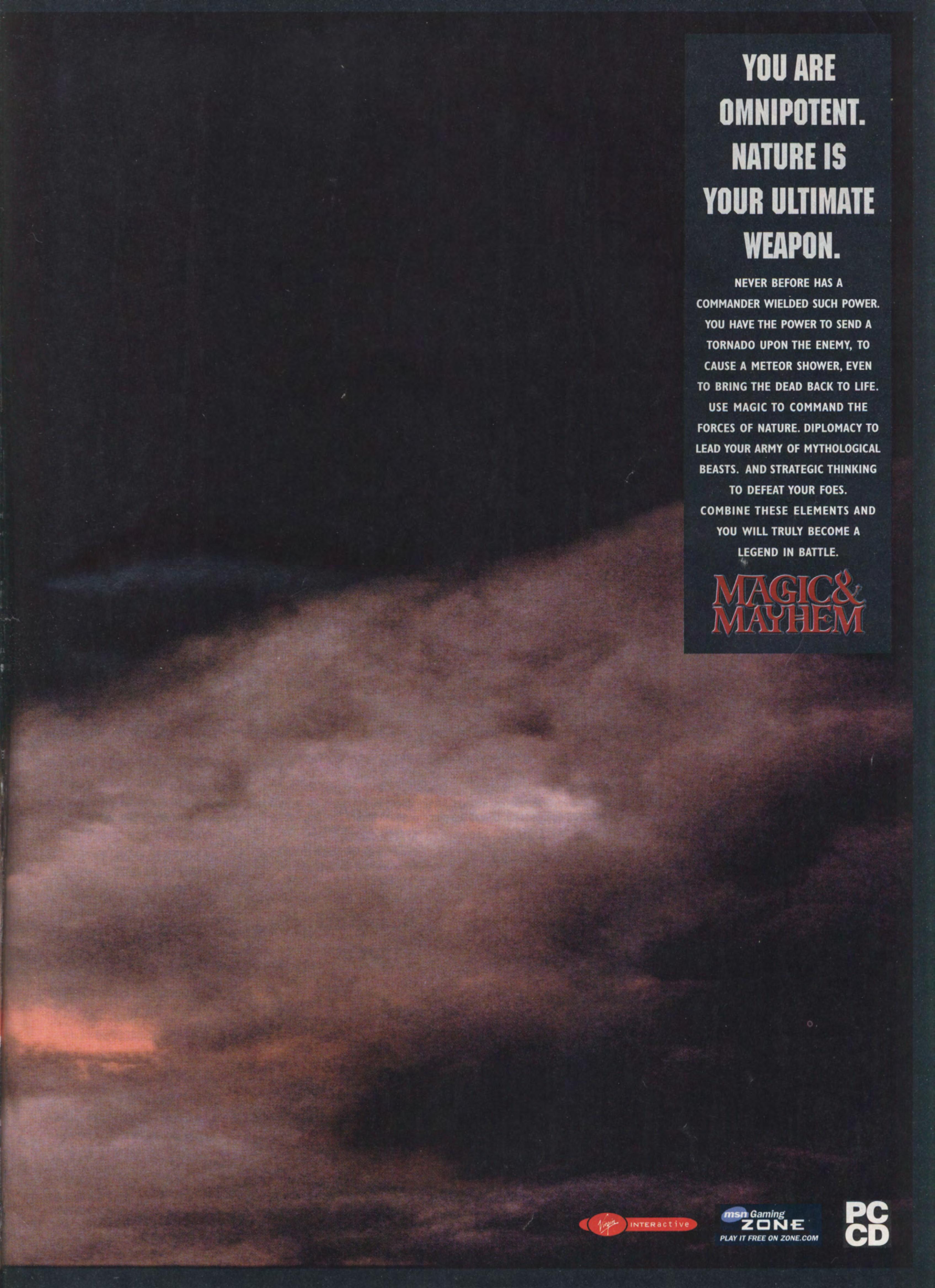 Many of the creatures have different abilities: the dragon can breath fire and can fly; the vampire can morph into a bat; the hellhound has a gaze which stuns; and so on. There are some spectacular spells such as Cjudgement', which can shatter any number of creatures within its range. Some of the more subtle spells are just as much fun. Illusion, for instance, enables you to make illusory copies of your own wizard which are effective decoys to distract your opponents. There are also Ctotems', which are like giant statues. Although they are static they have an effect over the surrounding area. A good example of a totem is Cpestilence', which infects nearby creatures with the plague, which can then spread.