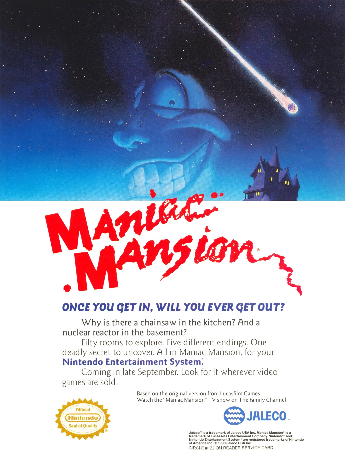 Fifty rooms to explore. Five different endings. One deadly secret to uncover. All in Maniac Mansion, for your Nintendo Entertainment System!
