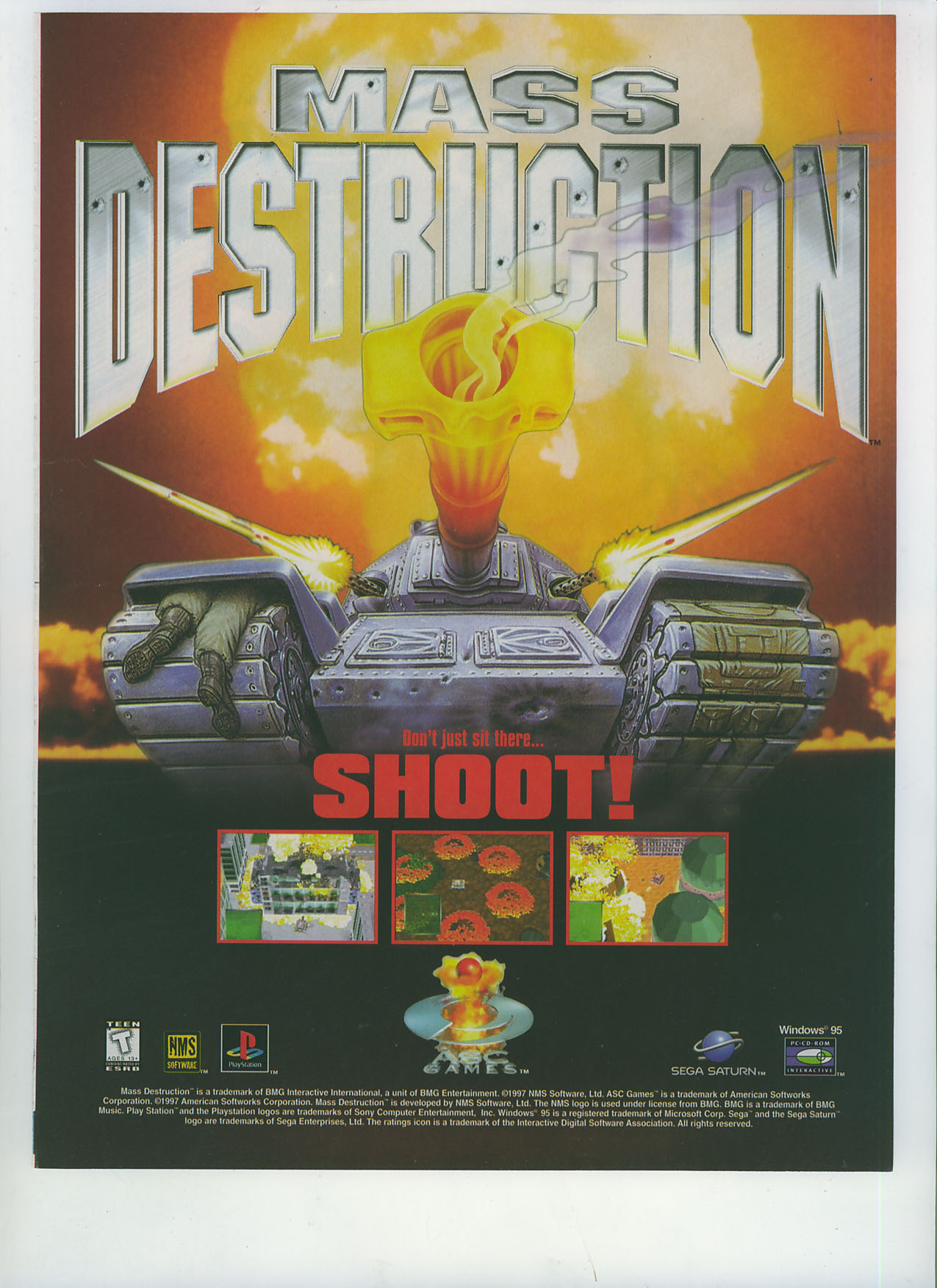 This one seems like it has been coming out forever, but it's here now and that's what counts. I would go as far as to say Mass Destruction is on the same level as Return Fire. What makes it a bit more fun than Return Fire is that there's more than capture the flag, but then again Mass Destruction doesn't have a Two-player Mode. I had a lot of fun playing through this one (although I liked the Saturn one even better). The thing about Mass Destruction that's weird is that even though the graphics are more or less untextured polygons. it's alright-it works. Other enhancements were added to the game from the earlier versions like transparency to objects obstructing view of your tank. Other effects that have been there from the beginning are the cool reflections on water and the intense flames from the flamethrower (plus you can set the enemies on fire). The game featured just enough levels, and there are undisclosed bonus objectives to add to the replay. I wouldn't have minded seeing a little more variety in the landscapes. A couple other small gripes are the lack of really cool-looking weapons (only the flamethrower was really cool-looking) and the lack of other vehicles to choose from, but then maybe it would be too much like Return Fire. As mentioned, a Two-player Mode would've been icing on the cake.