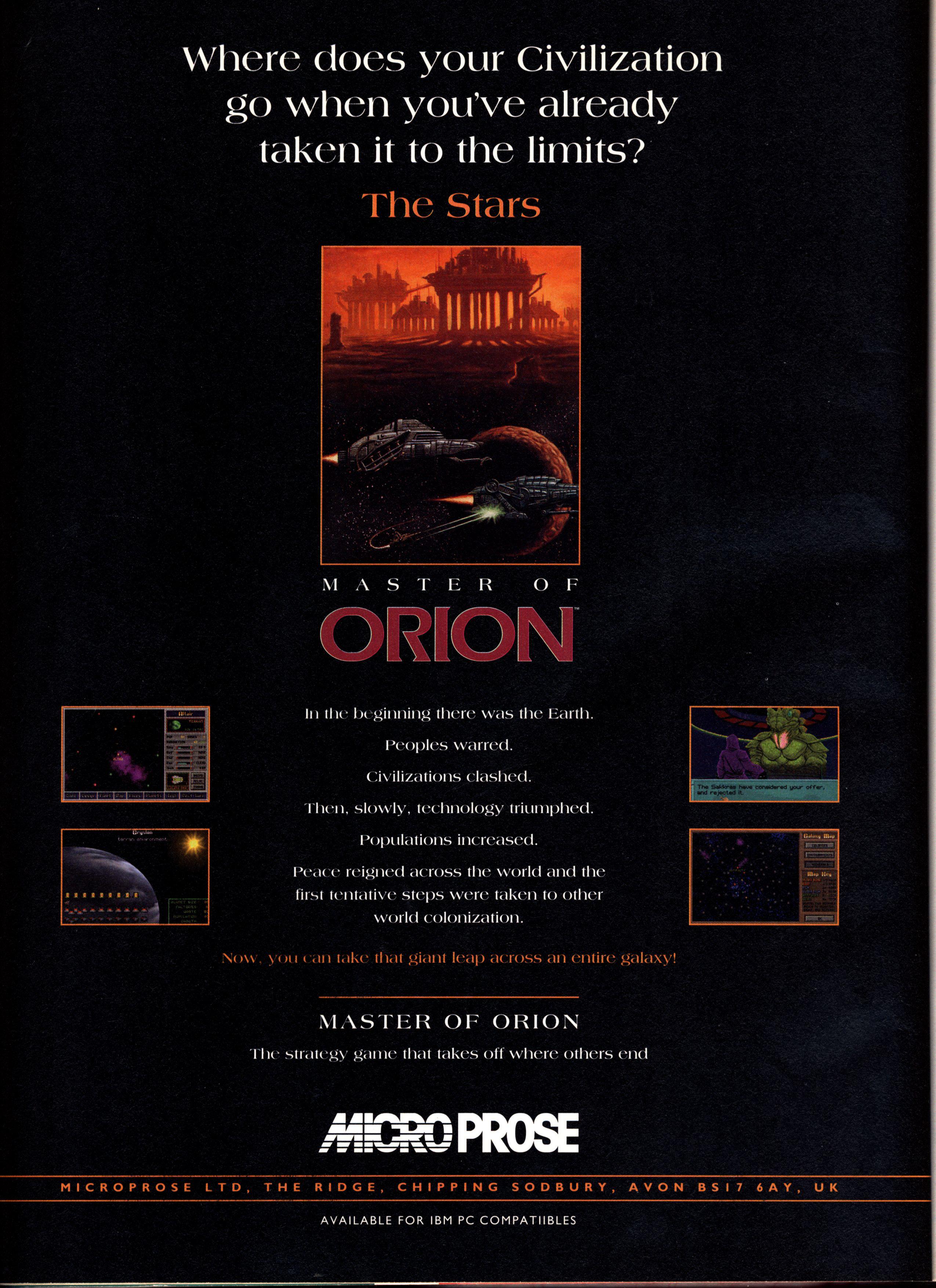 Space, think about it for too long and it can do your head in. Space strategy games can have much the same effect. The more you play them, the more you lose touch with reality. You get so engrossed in the defence revenue of the planet Dork, and the race to be the first to develop the Fluoride-Paste Fusion laser, that events happening in the real world (i.e. not on your pc screen) seem light years away. Of course this can happen with any kind of game, but it's easier to explain away the thrills of ripping the head off a sprite in a beat 'em-up or flying the latest turbo jet in a new flight sim than it is to say, 'Actually, I've spent the last few nights allocating the planetary budget for Zwathos and developing a nucleus-schmucleus engine that can reach a top speed of ten parsecs a sencoid'. People tend to say: 'Err, sorry mate, I haven't got any change,' and walk off at a brisk pace. But space strategies can be a lorra fun and Master Of Orion is a true strategy game, more akin to Civilization than a war game. MicroProse has produced a game for the megalomaniac where you start off with a single planet and attempt to pull an entire galaxy into your grasp by fighting, spying, breeding, constructing, engineering and, of course, accounting.