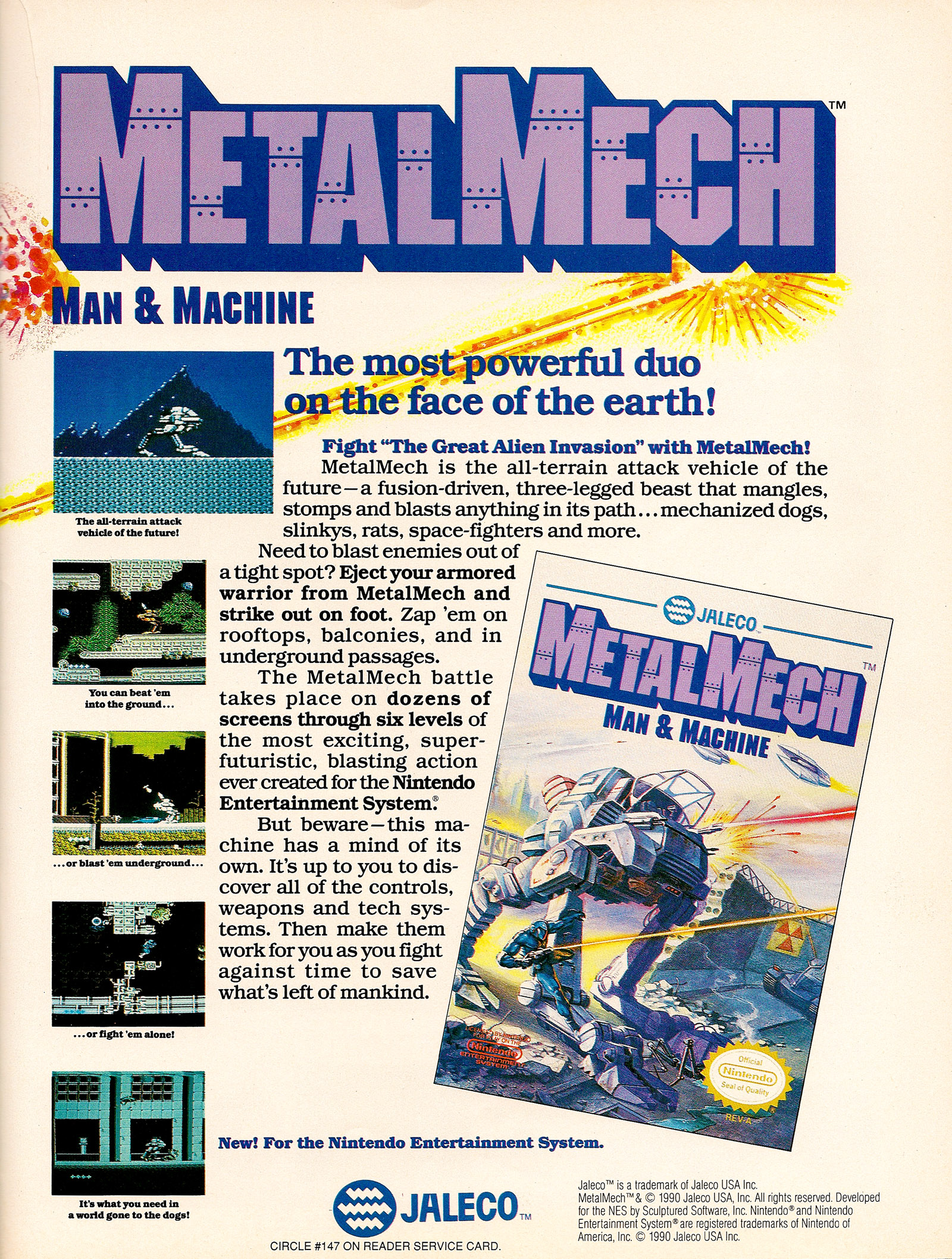 The MetalMech battle takes place on dozens of screens through six levels of the most exciting, super futuristic, blasting action ever created for the Nintendo Entertainment System.