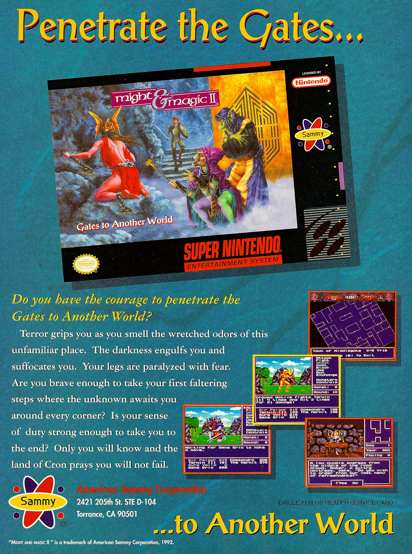 American Sammy is fulfilling the needs of many role players with their Might & Magic series. With Might & Magic on its way to the NES, there also will be Might & Magic II for the SNES!
